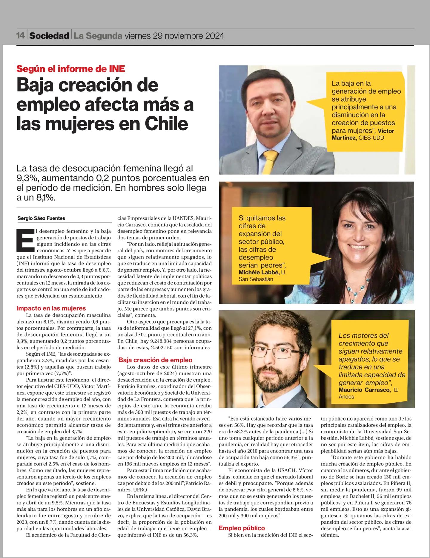 Baja creación de empleo afecta más a las mujeres en Chile 29-11-2024 La Segunda |