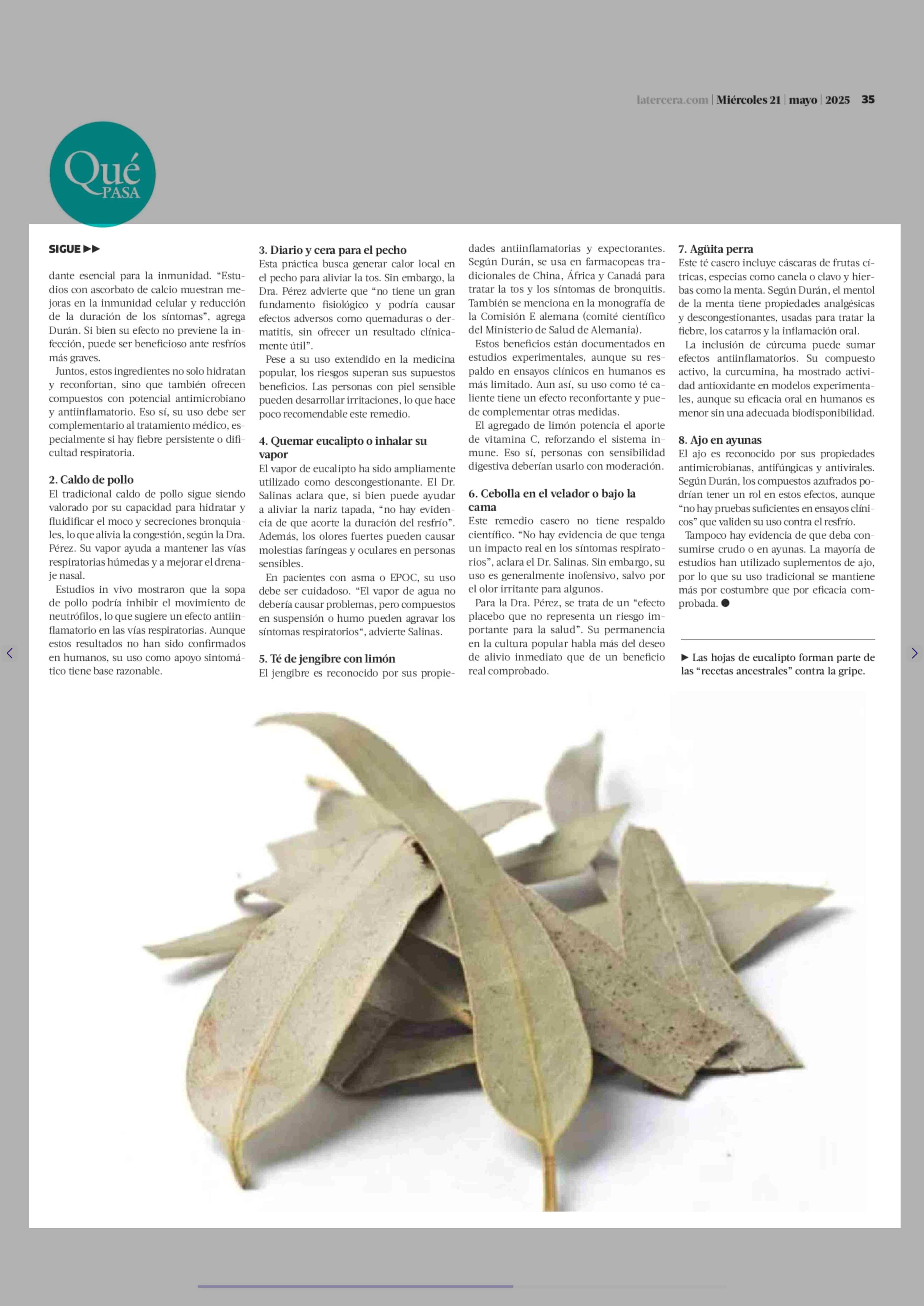 Miel y eucalipto: un nutricionista y dos médicos evalúan efectividad de ocho remedios caseros para el resfrío 21-05-2025 La Tercera |