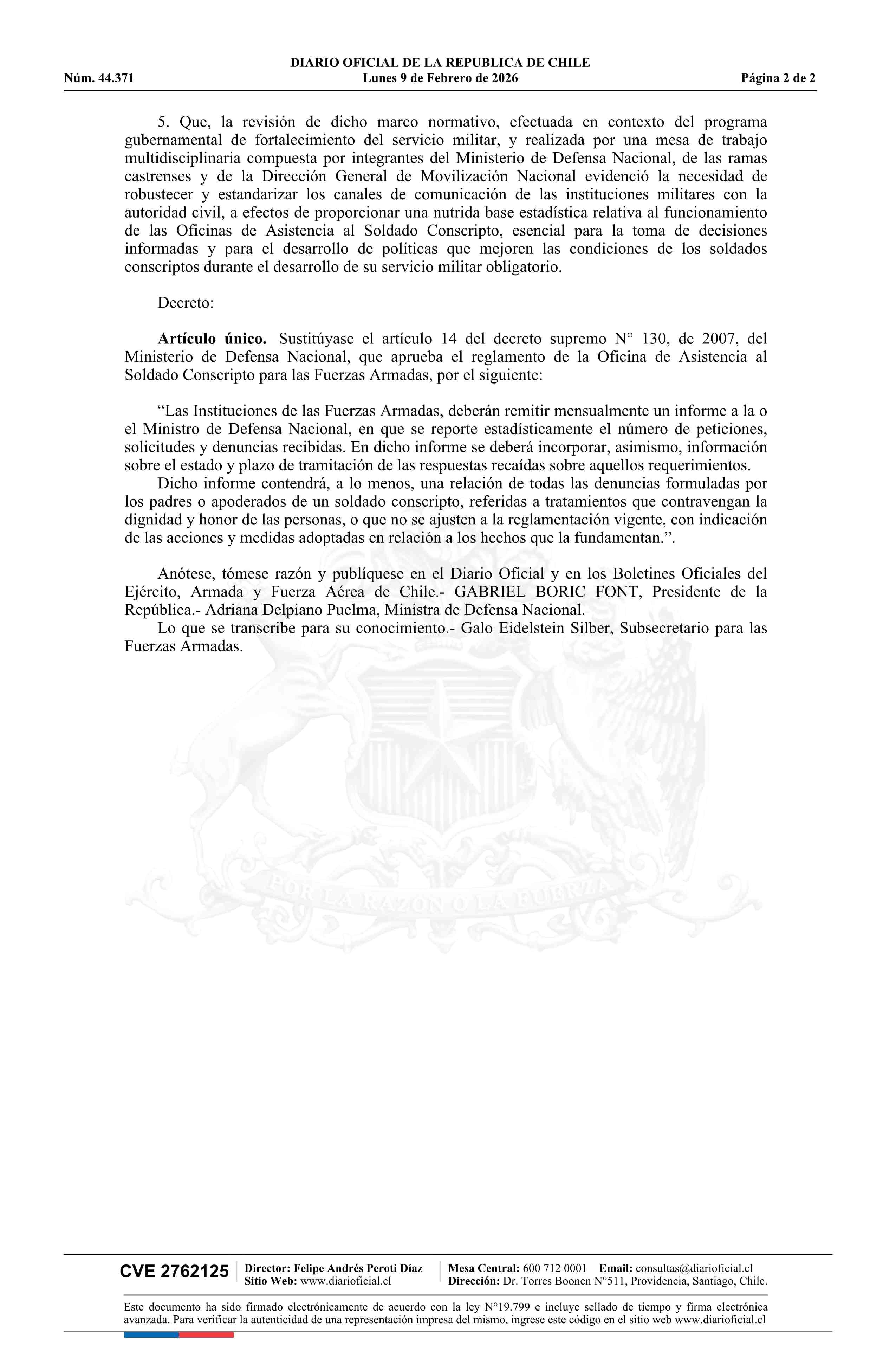 Decreto número 188, de 2025.- Modifica decreto N° 130, de 2007, que aprueba Reglamento de la Oficina de Asistencia al Soldado Conscripto de las Fuerzas Armadas 09-02-2026 Diario Oficial Edición Electrónica |