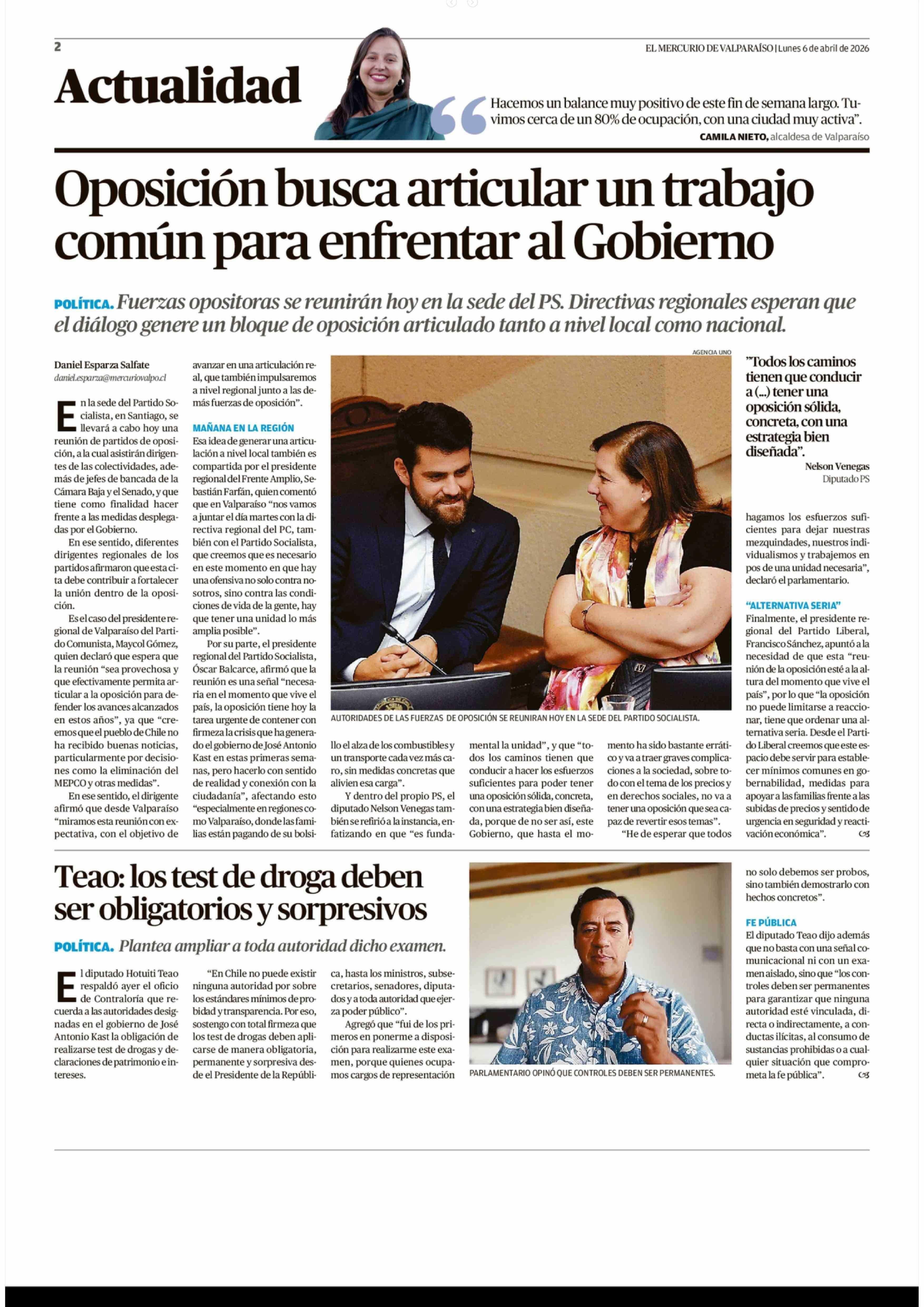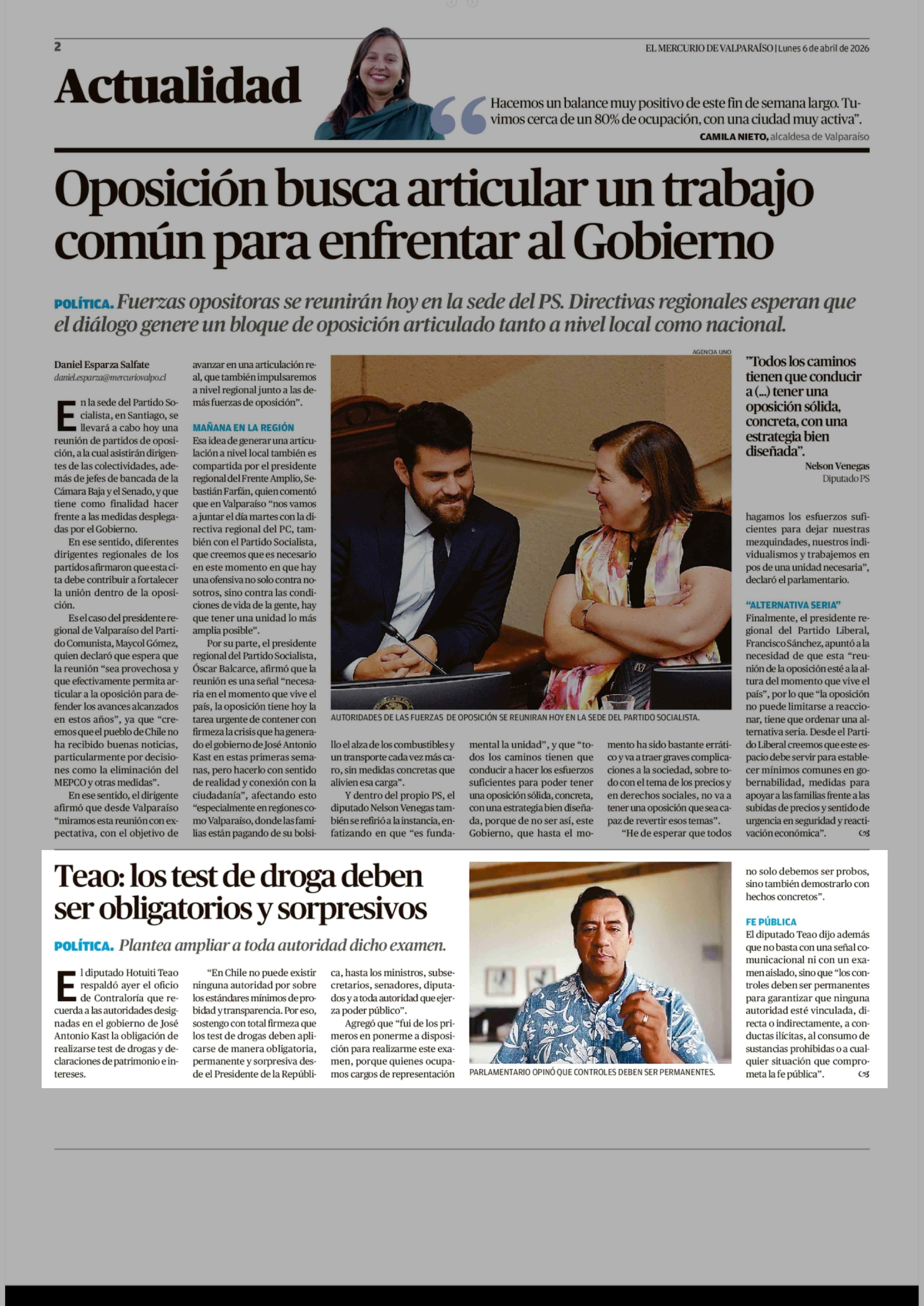 Teao: los test de droga deben ser obligatorios y sorpresivos 06-04-2026 El Mercurio de Valparaíso |