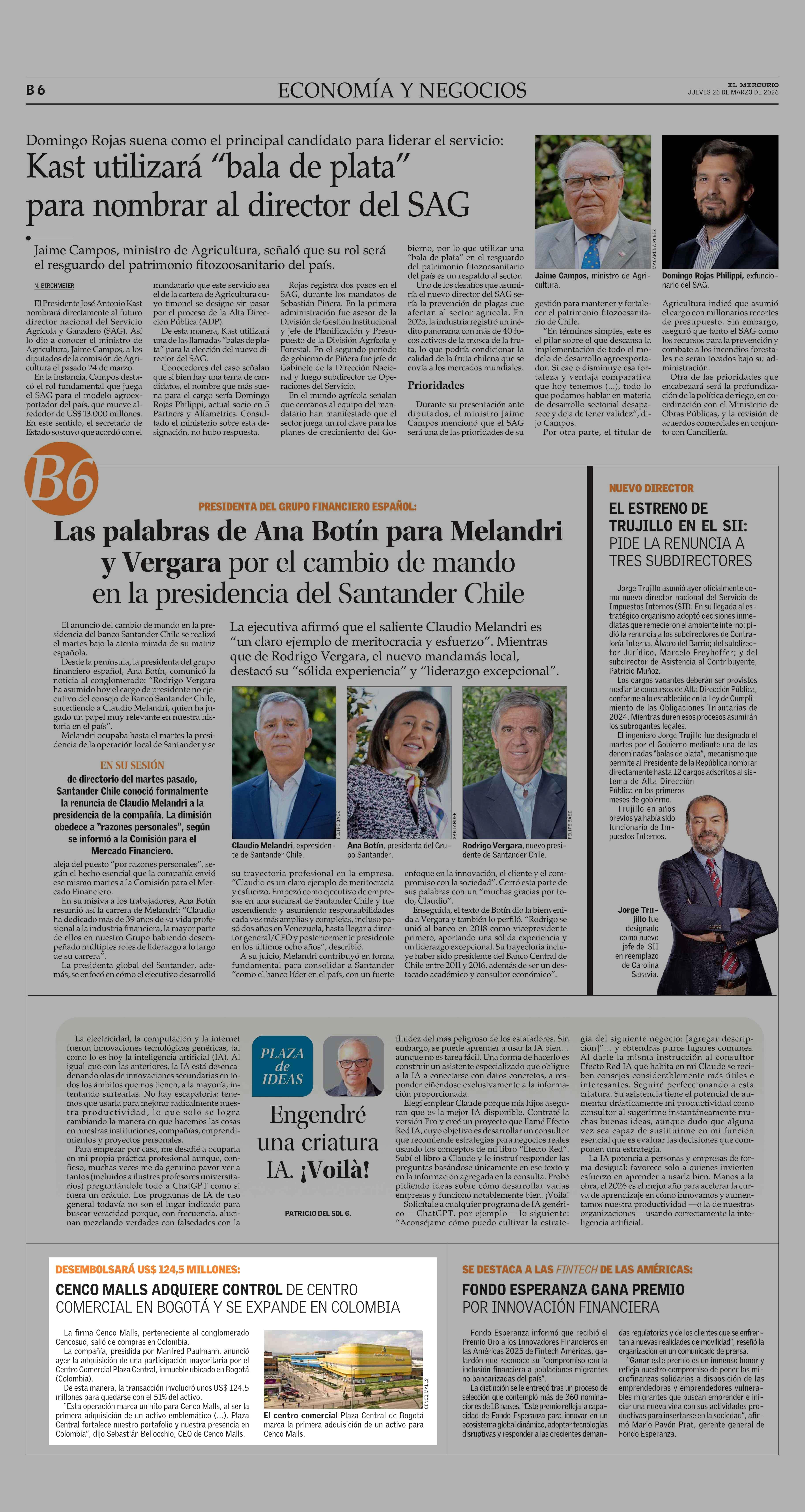 CENCO MALLS ADQUIERE CONTROL DE CENTRO COMERCIAL EN BOGOTÁ Y SE EXPANDE EN COLOMBIA 26-03-2026 El Mercurio |