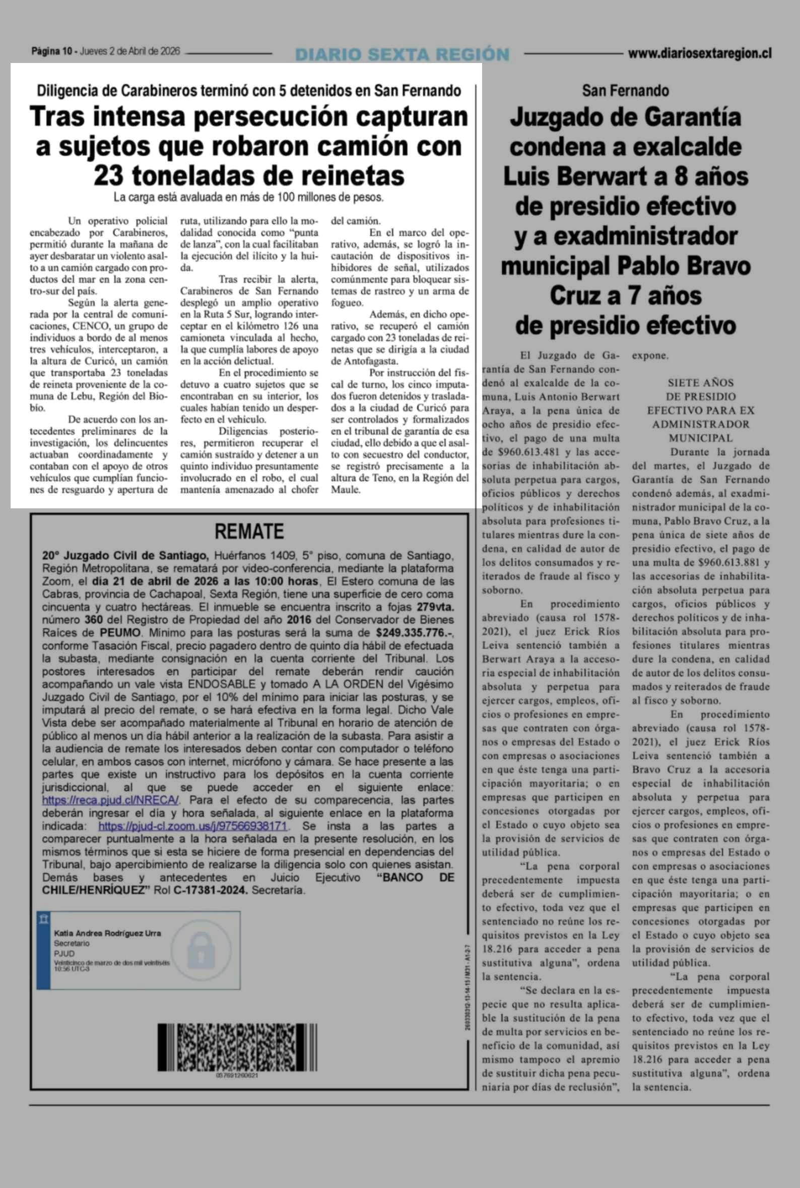 Fuente: Diario VI Región (Diario VI Región) Página(s): 10
