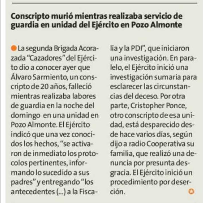 | Título: | Conscripto murió mientras realizaba servicio de guardia en unidad del Ejército en Pozo Almonte |