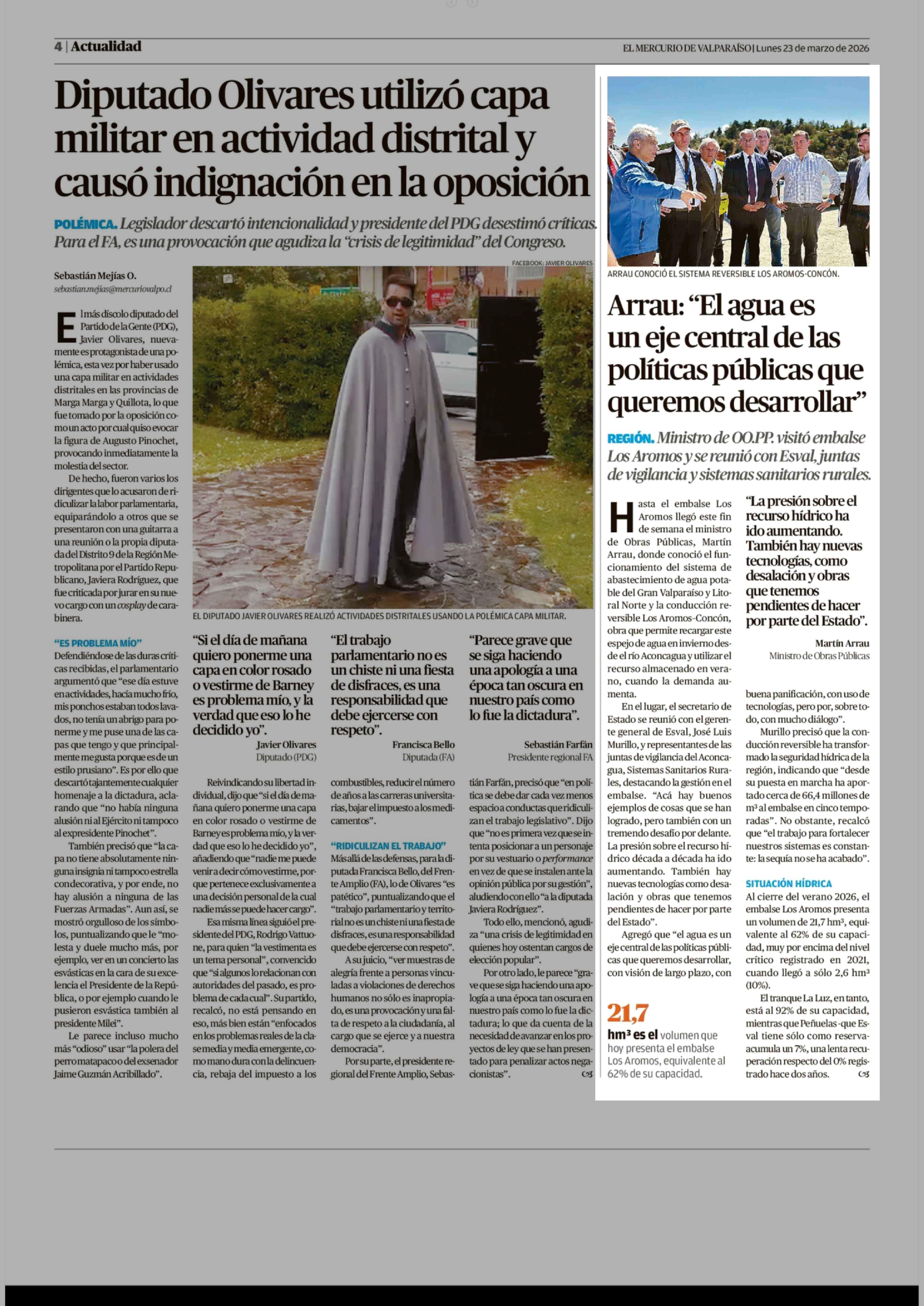 Arrau: "El agua es un eje central de las políticas públicas que queremos desarrollar" 23-03-2026 El Mercurio de Valparaíso |