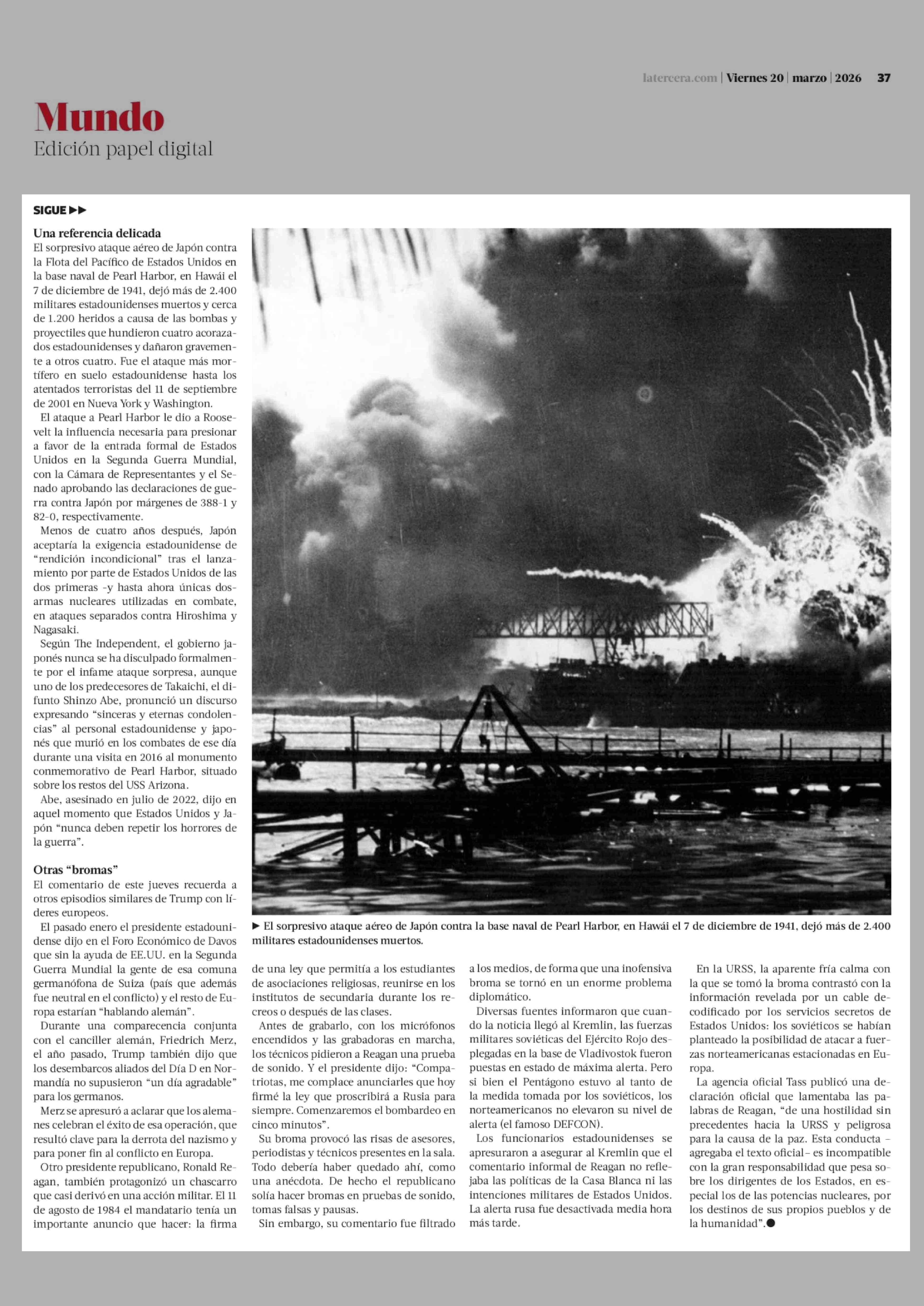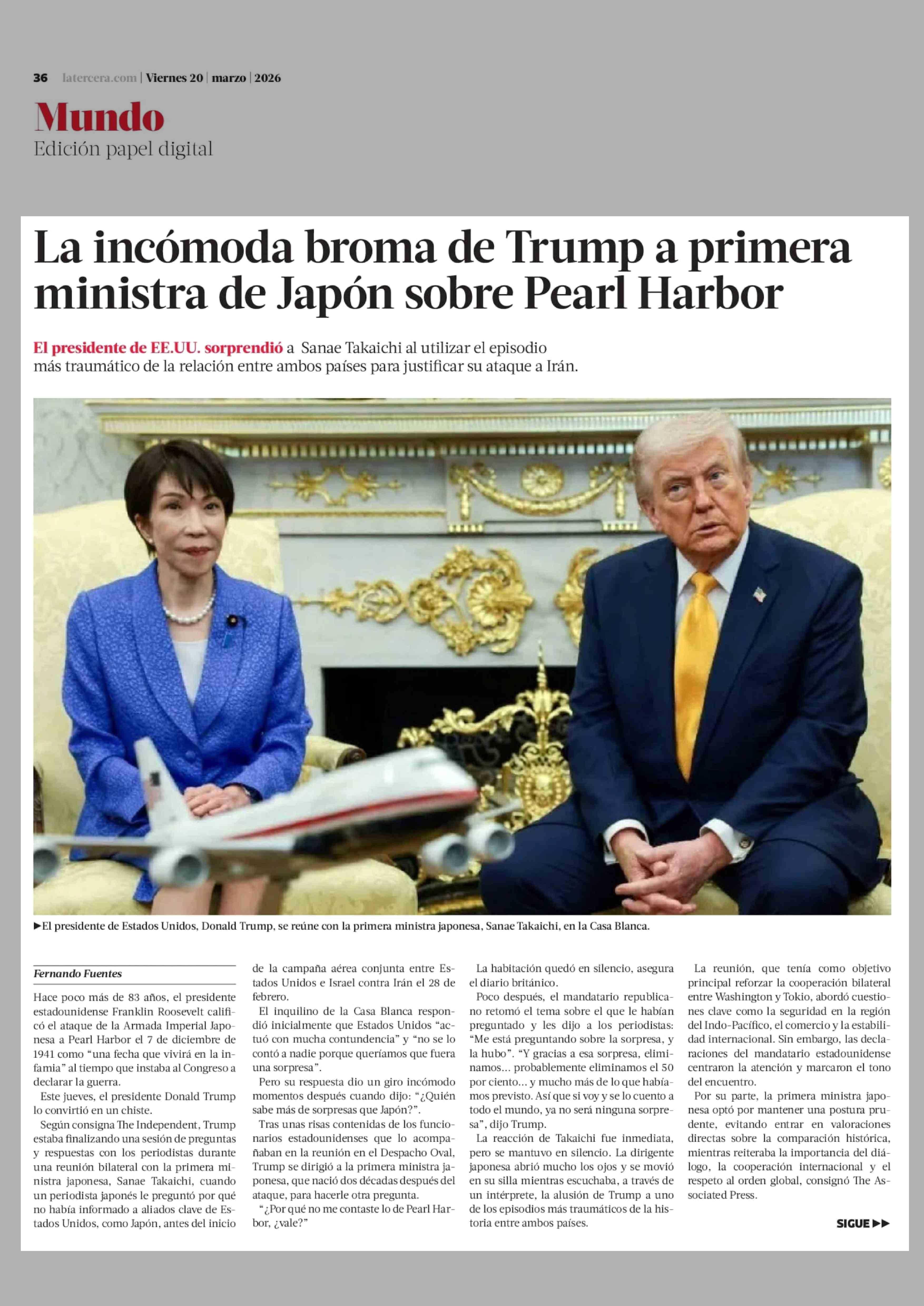 La incómoda broma de Trump a primera ministra de Japón sobre Pearl Harbor 20-03-2026 La Tercera |