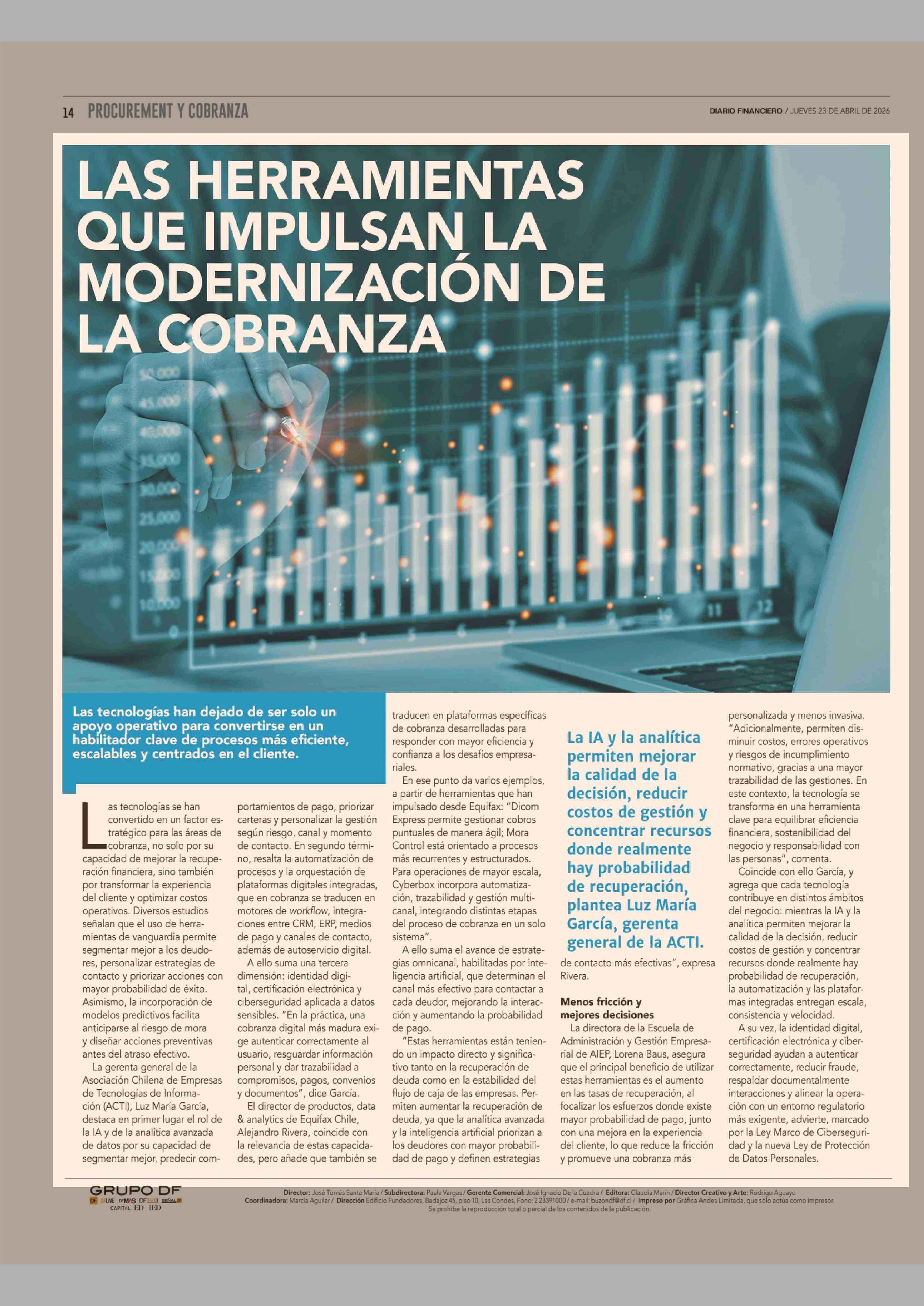 LAS HERRAMIENTAS QUE IMPULSAN LA MODERNIZACIÓN DE LA COBRANZA 23-04-2026 Diario Financiero |