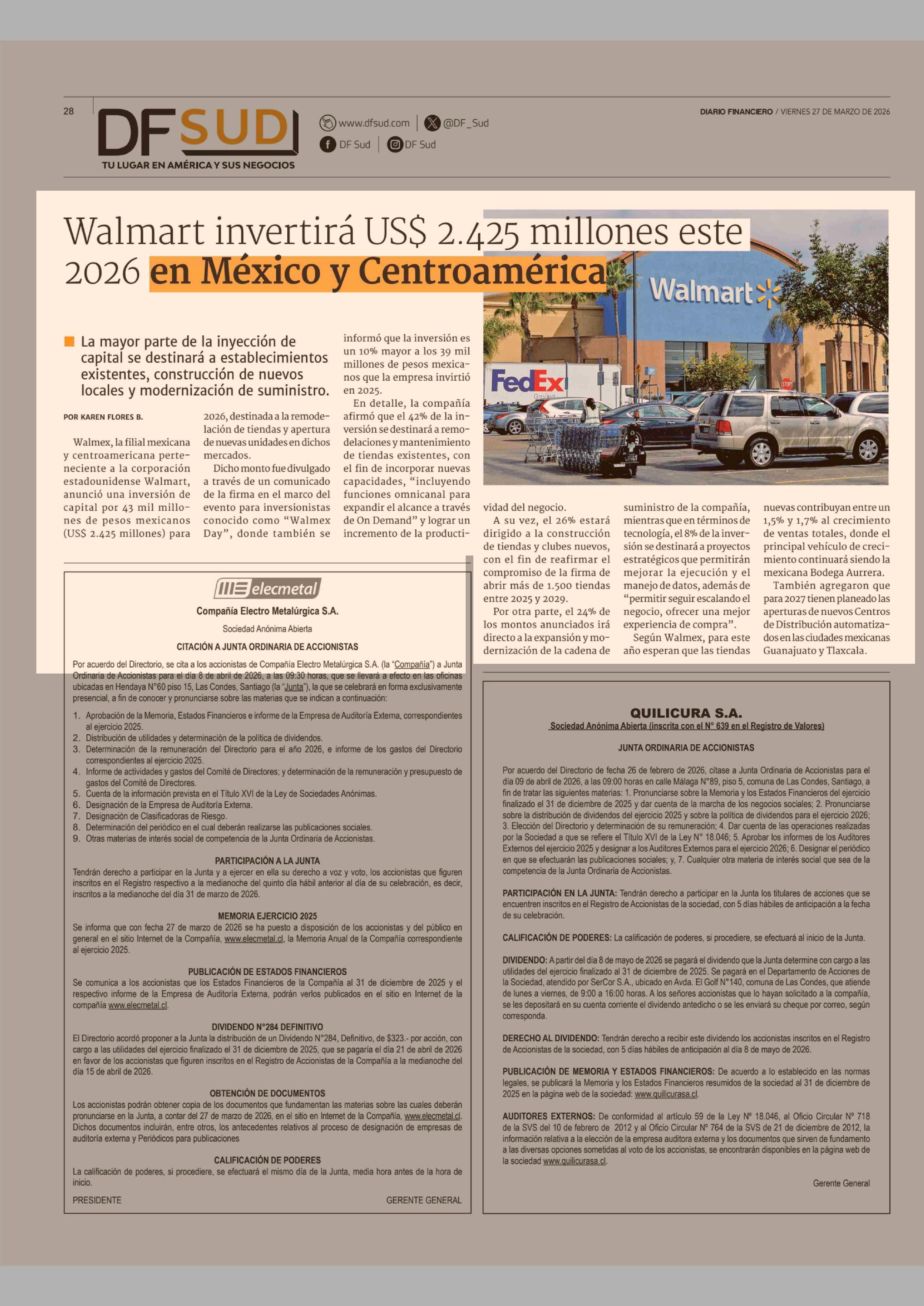 Walmart invertirá USS 2.425 millones este 2026 en México y Centroamérica 27-03-2026 Diario Financiero |