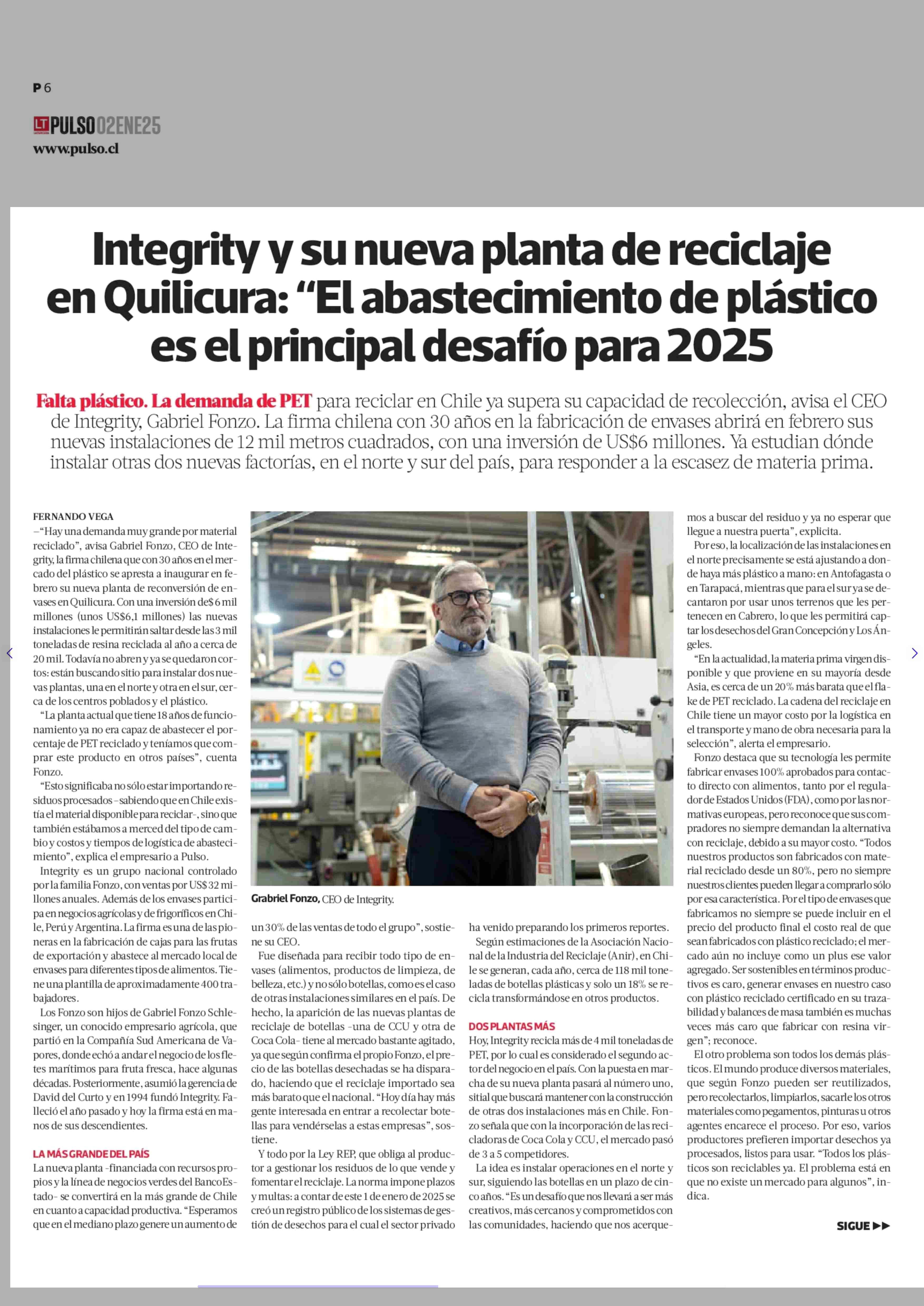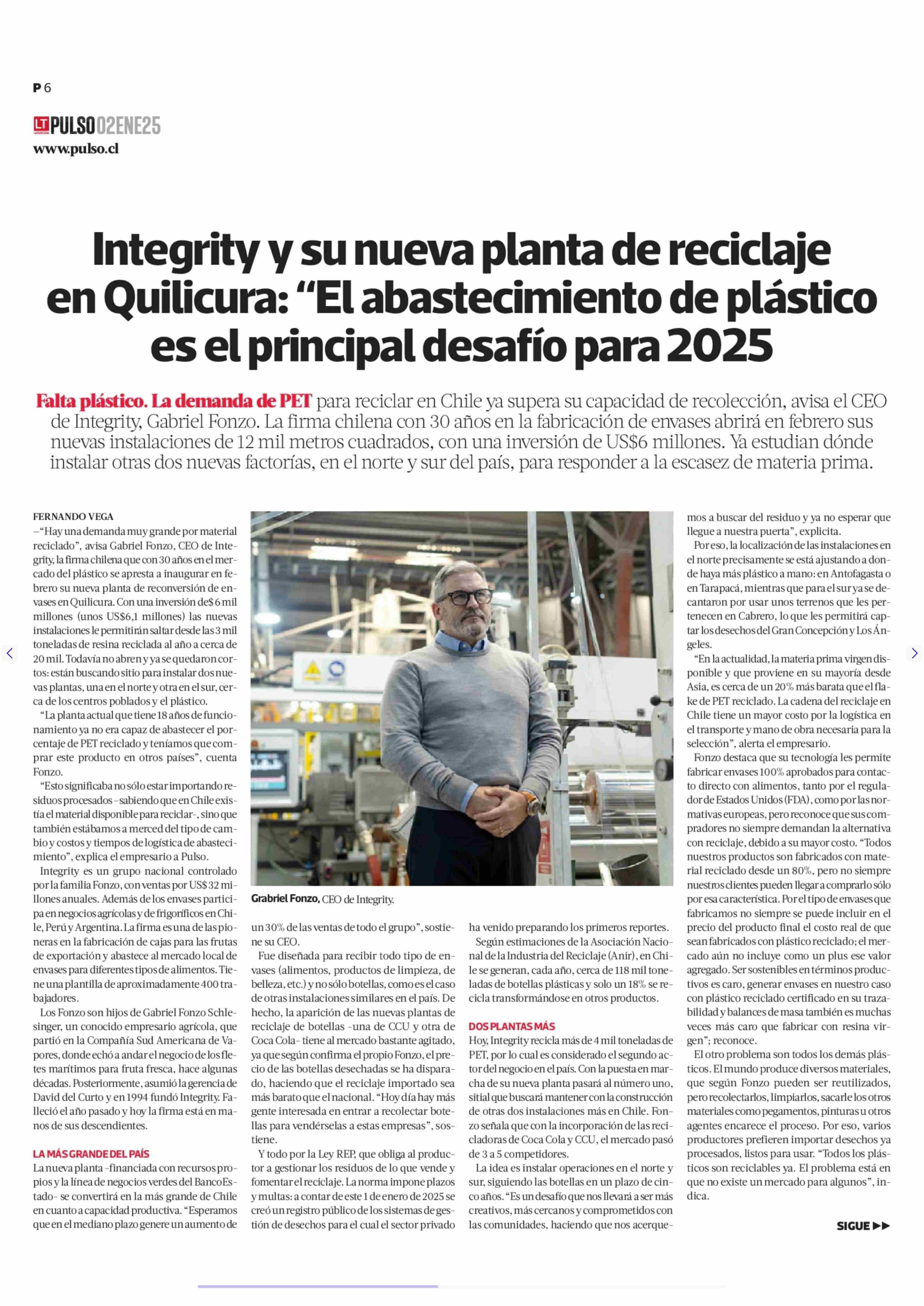 Integrity y su nueva planta de reciclaje en Quilicura: “El abastecimiento de plástico es el principal desafío para 2025 02-01-2025 La Tercera |