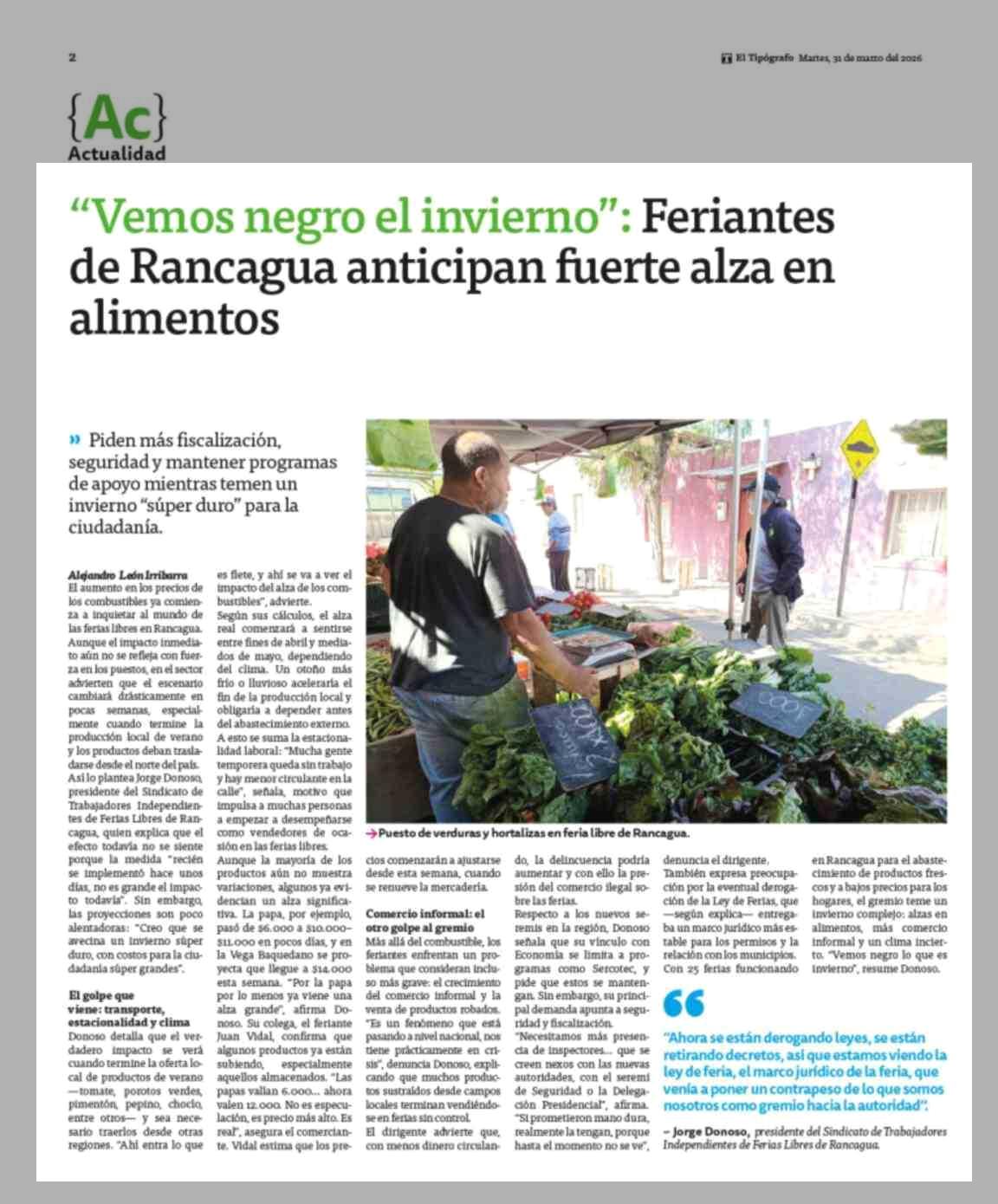 "Vemos negro el invierno": Feriantes de Rancagua anticipan fuerte alza en alimentos 31-03-2026 El Tipógrafo |