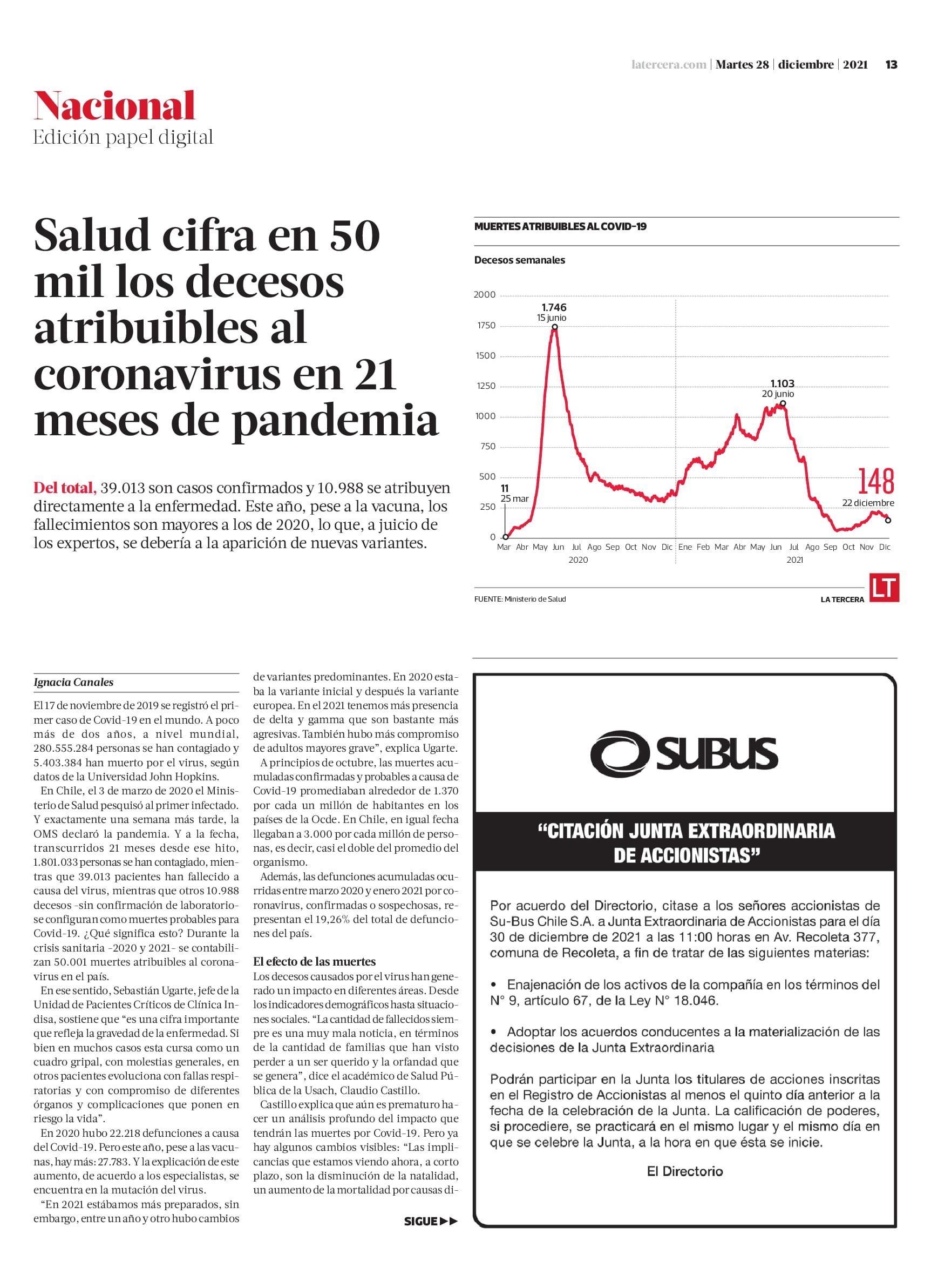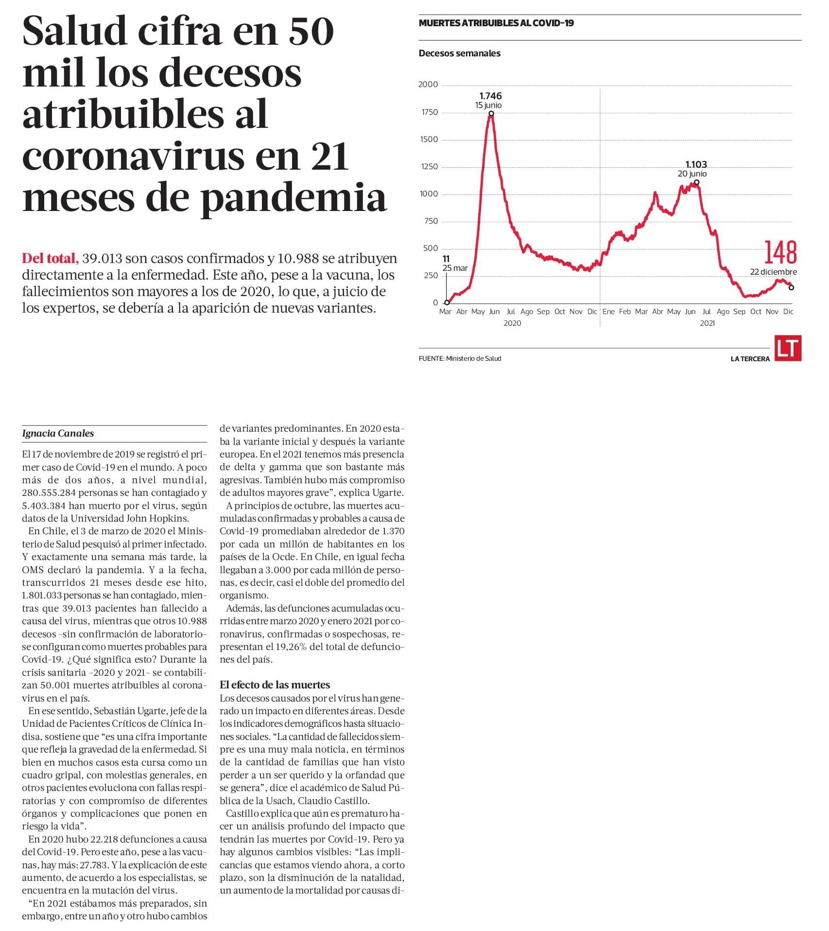 Salud cifra en 50 mil los decesos atribuibles al coronavirus en 21 meses de pandemia 28-12-2021 La Tercera |