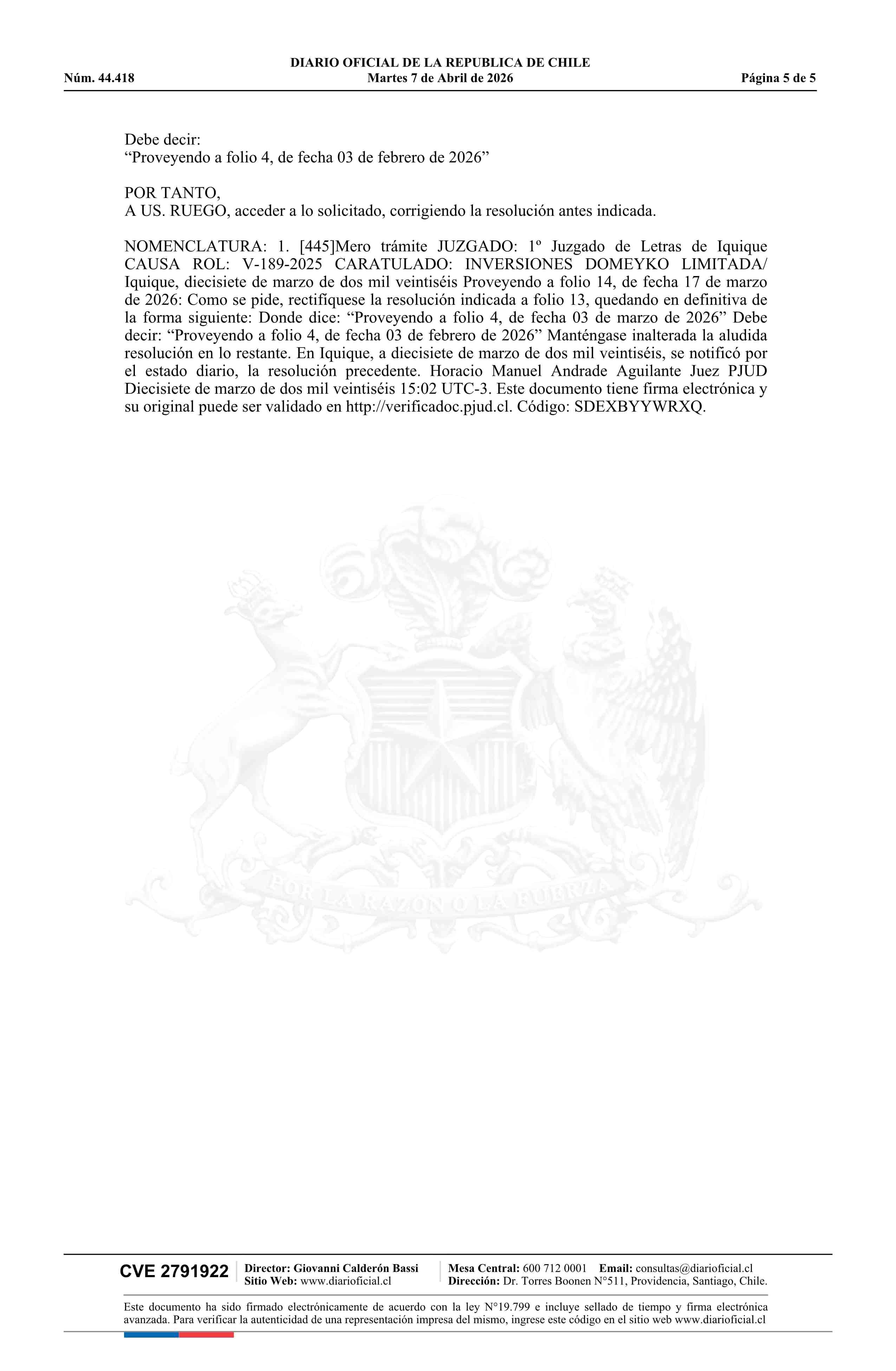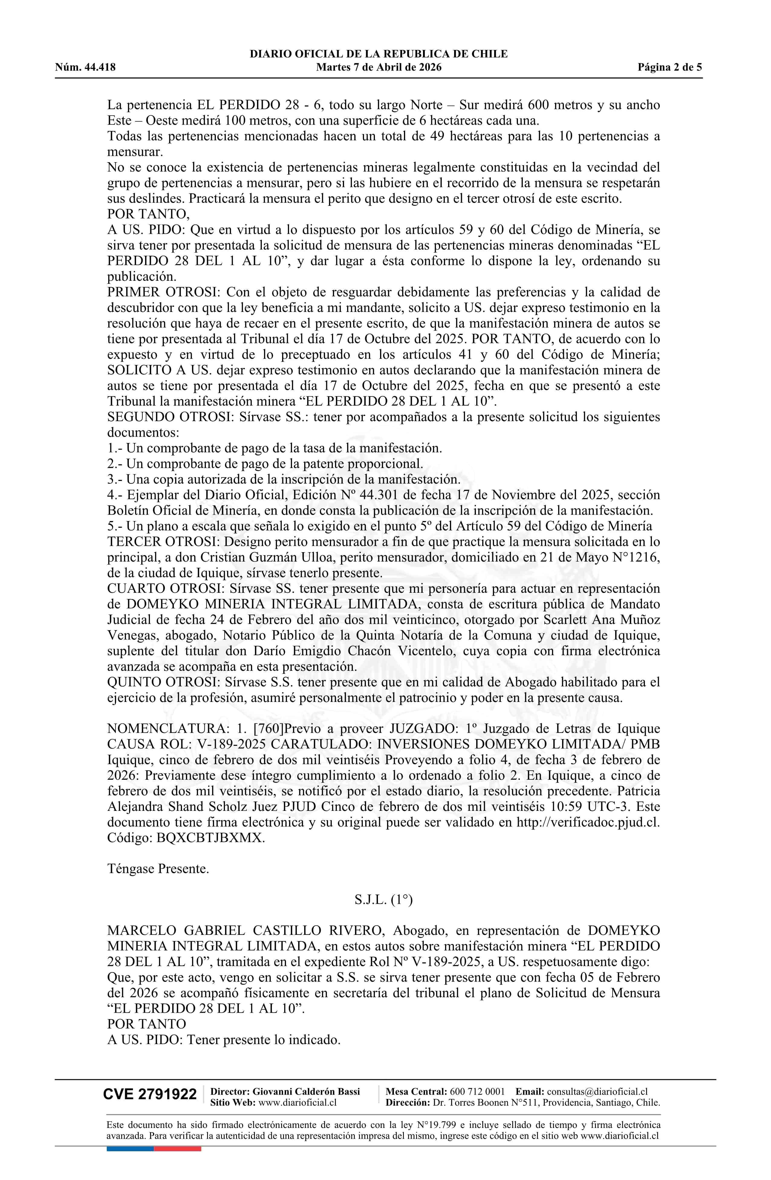 EL PERDIDO 28 DEL 1 AL 10 / Domeyko Minería Integral Limitada 07-04-2026 DIARIO OFICIAL CHILE - BOLETÍN OFICIAL DE MINERÍA |