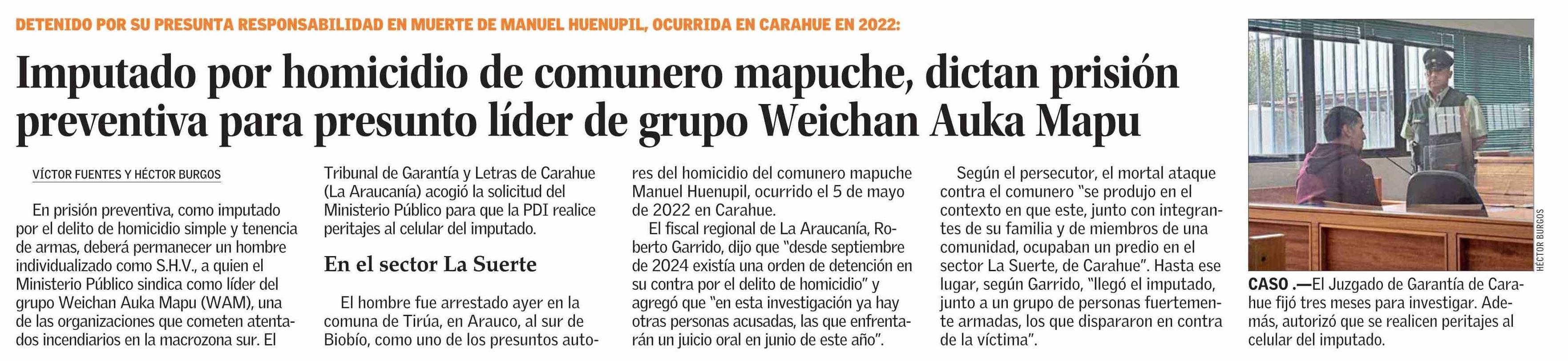 Título: Imputado por homicidio de comunero mapuche, dictan prisión preventiva para presunto líder de grupo Weichan Auka Mapu