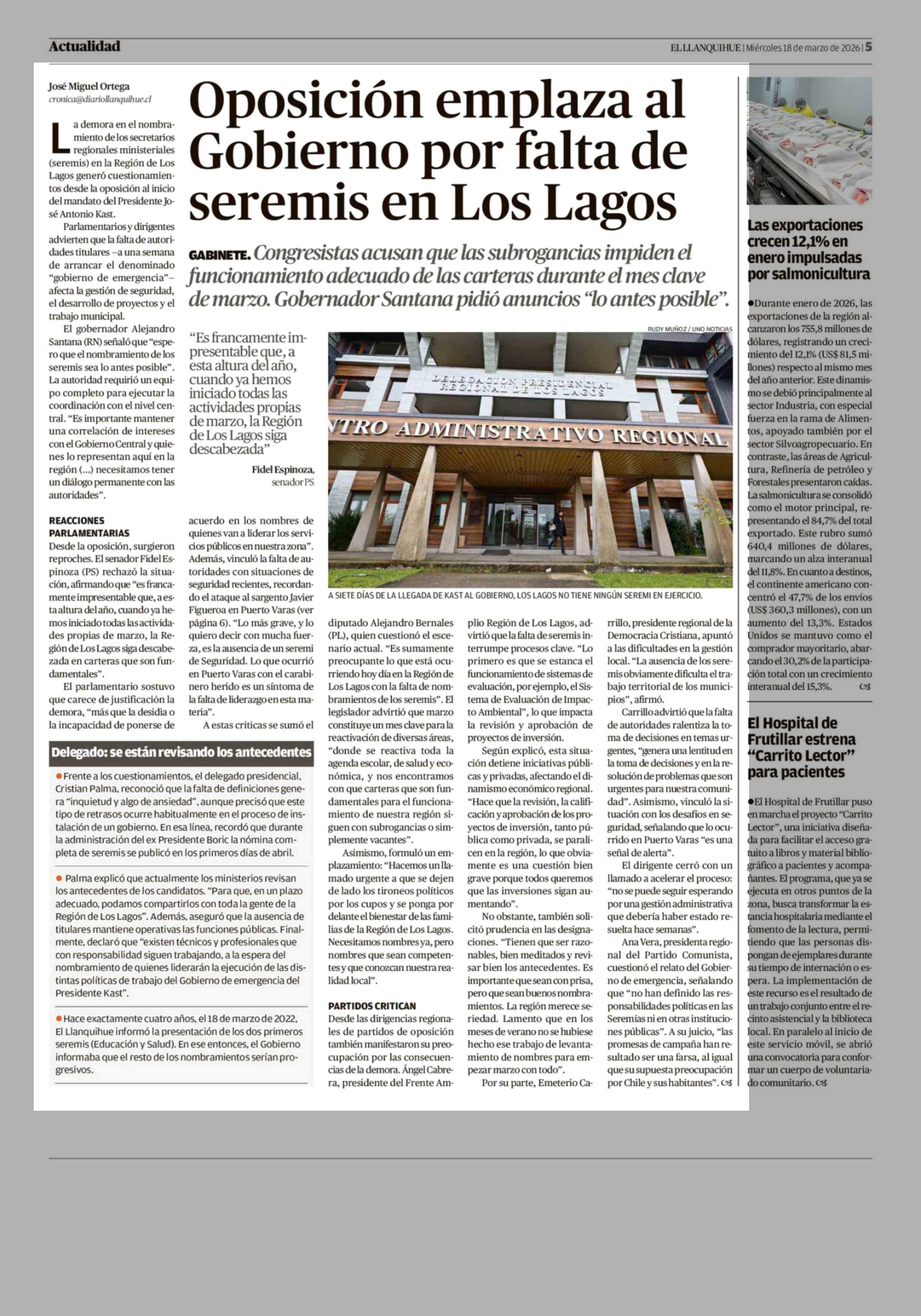 Oposición emplaza al Gobierno por falta de seremis en Los Lagos 18-03-2026 El Llanquihue |