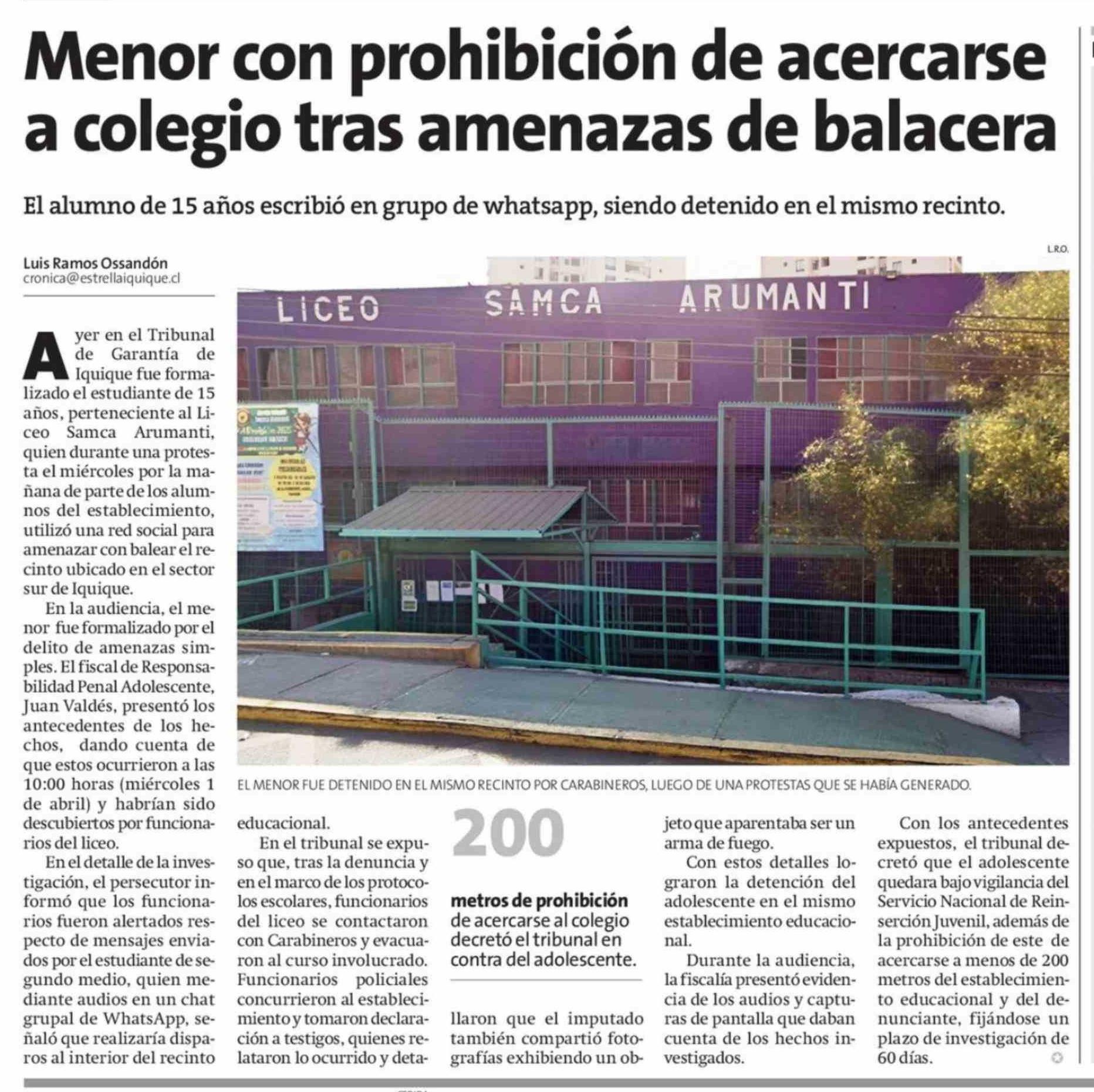Menor con prohibición de acercarse a colegio tras amenazas de balacera 03-04-2026 La Estrella de Iquique |