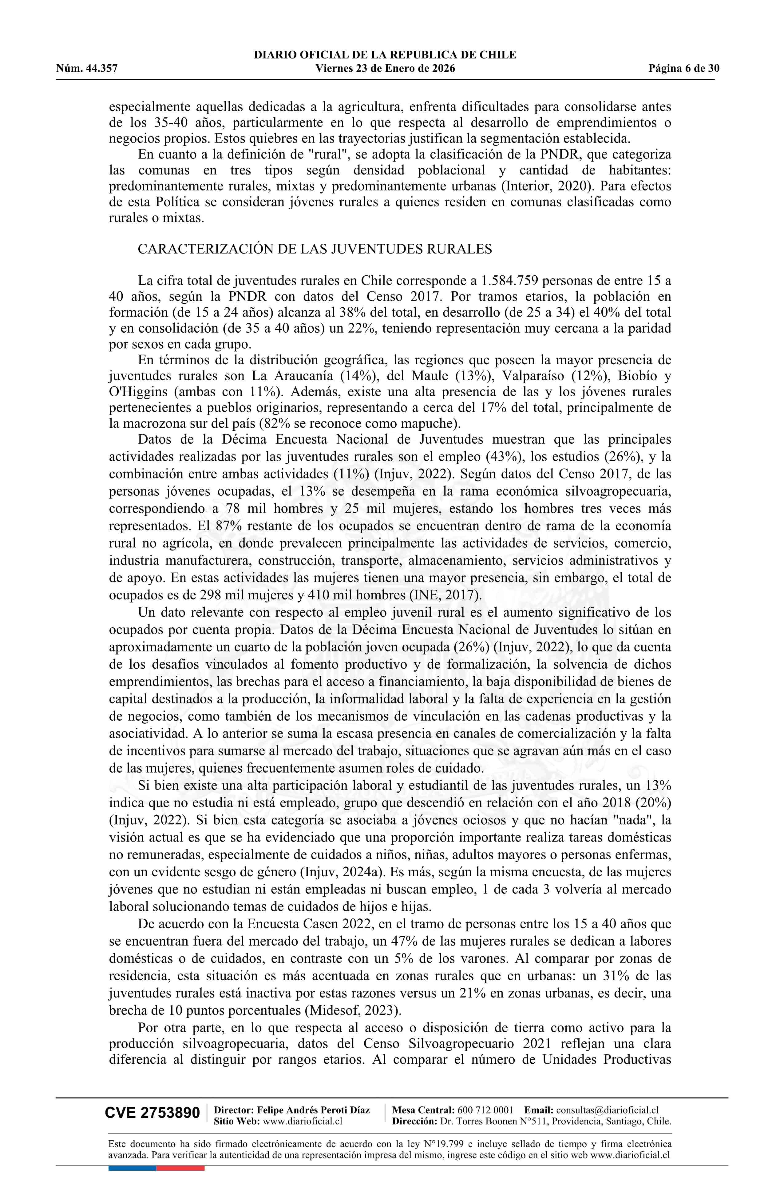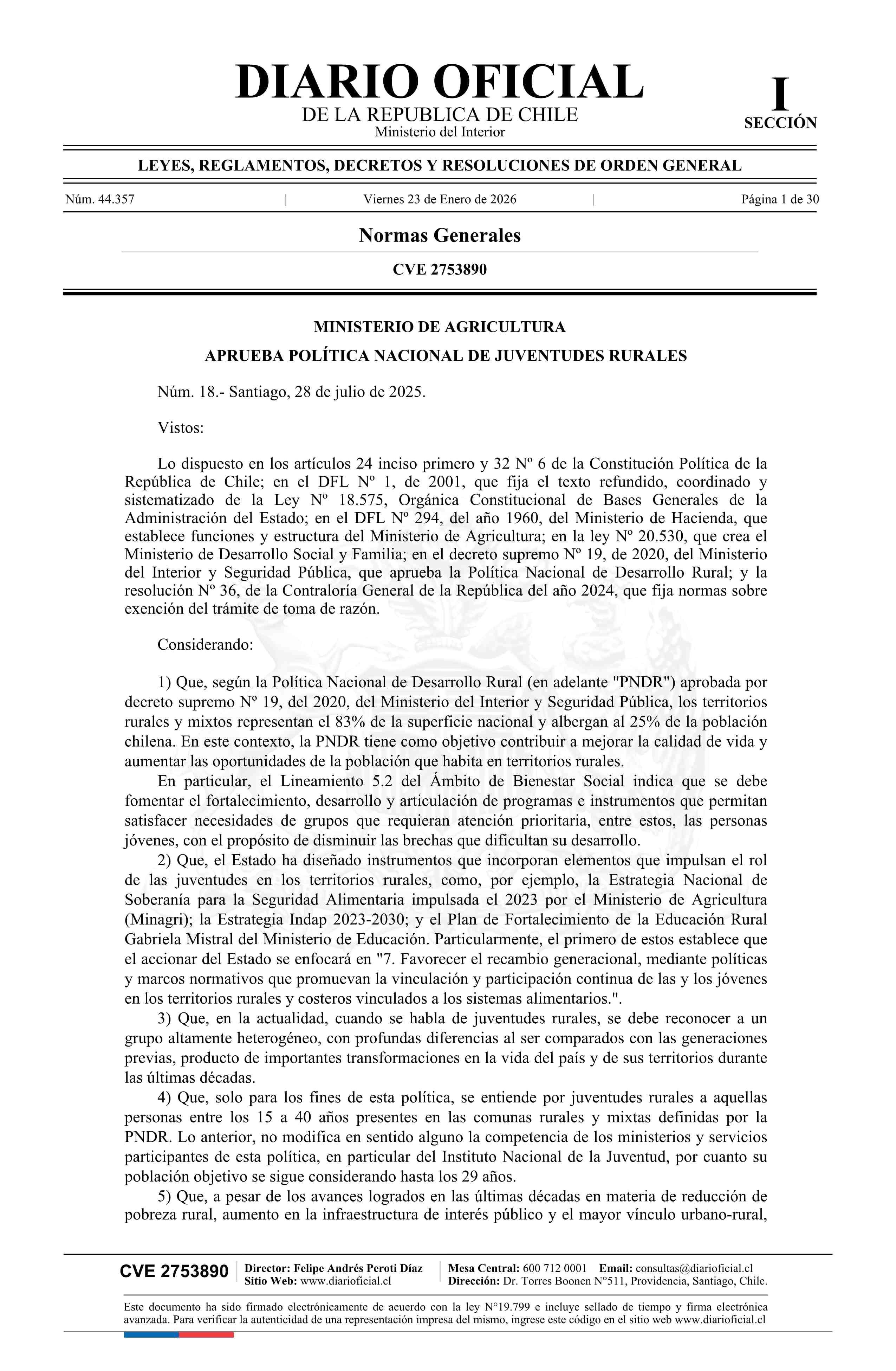 Decreto número 18, de 2025.- Aprueba Política Nacional de Juventudes Rurales 23-01-2026 DIARIO OFICIAL CHILE - BOLETÍN OFICIAL DE MINERÍA |