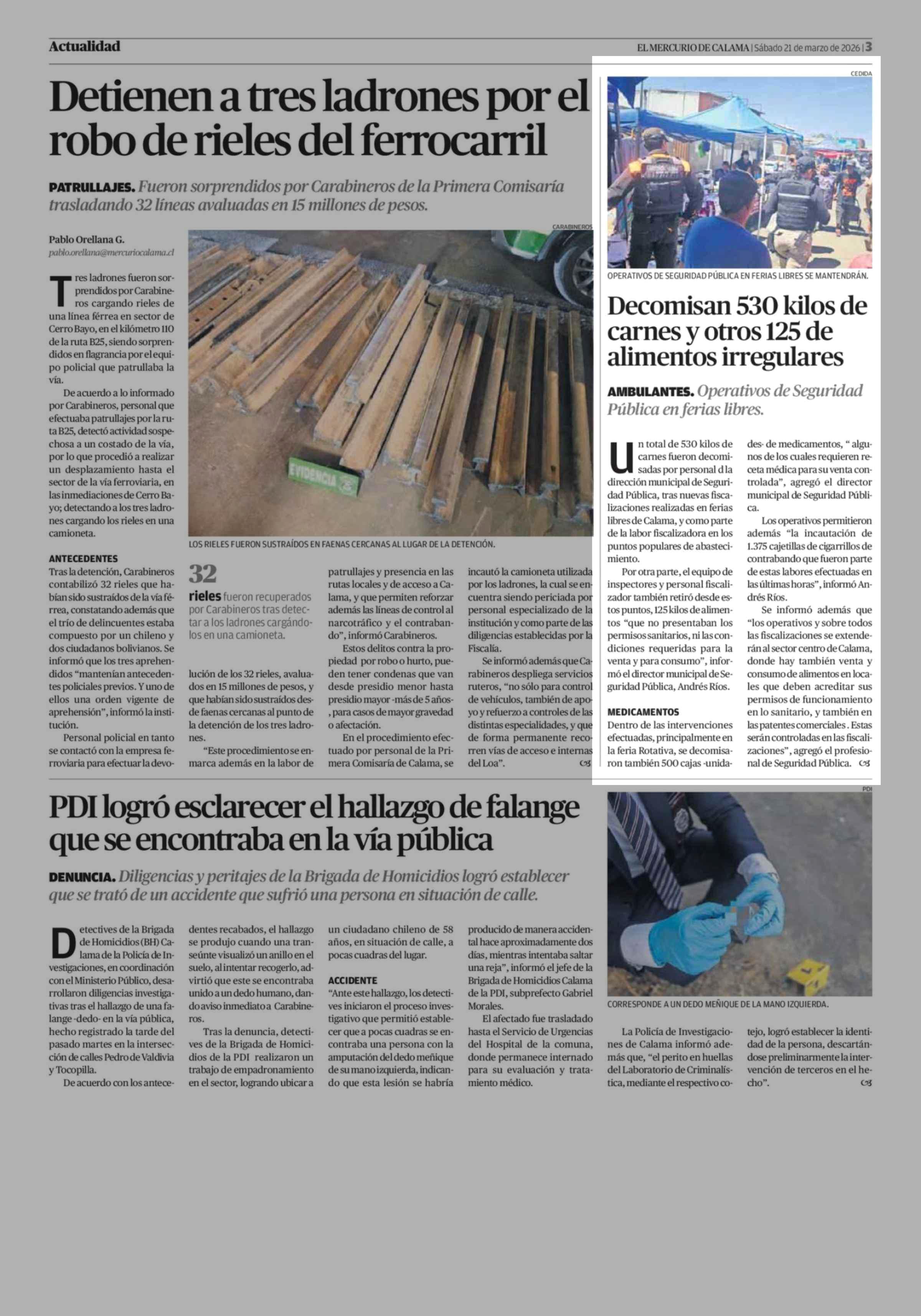 Decomisan 530 kilos de carnes y otros 125 de alimentos irregulares 21-03-2026 El Mercurio de Calama |