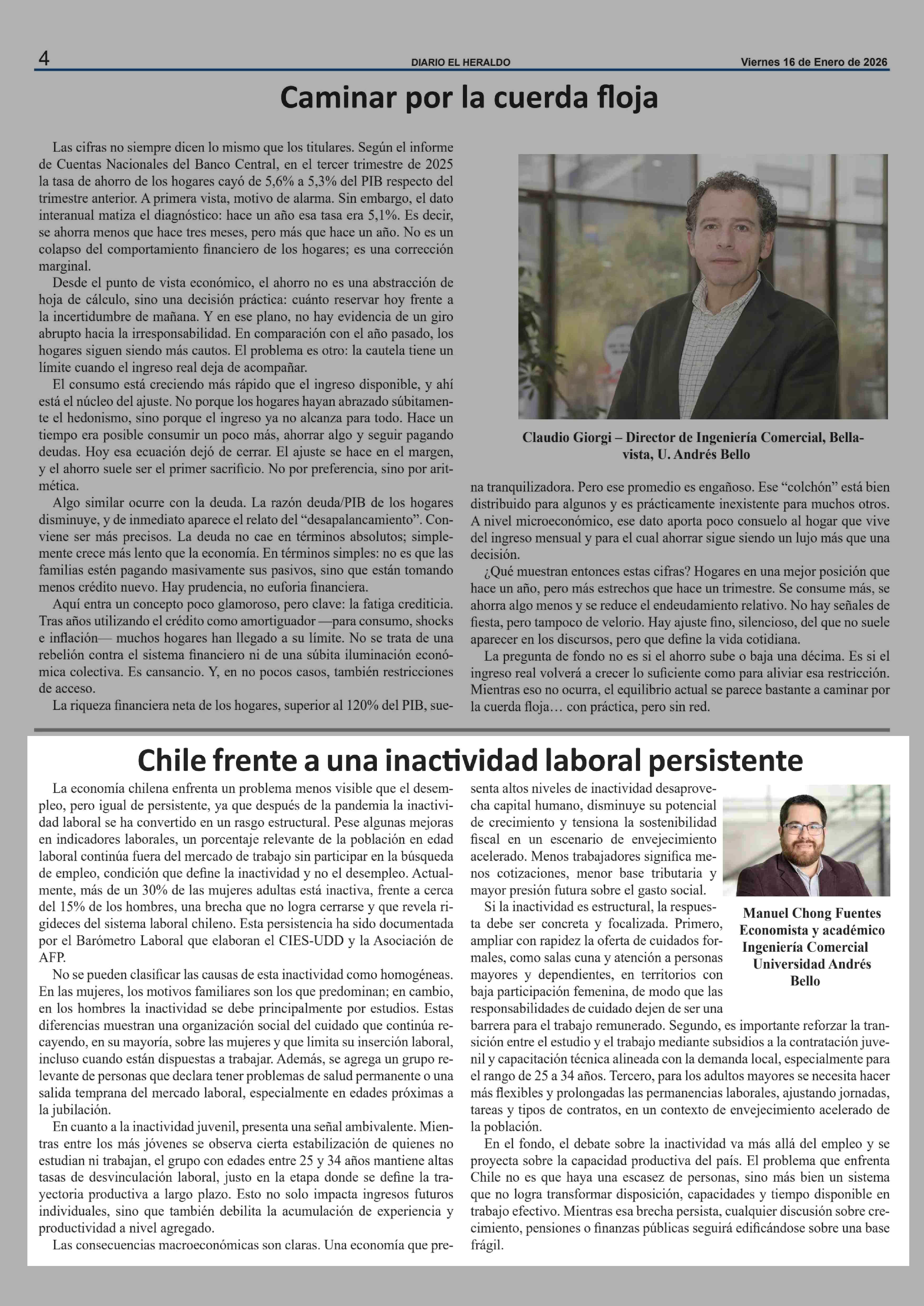 Columnas de Opinión: Chile frente a una inactividad laboral persistente 16-01-2026 El Heraldo |