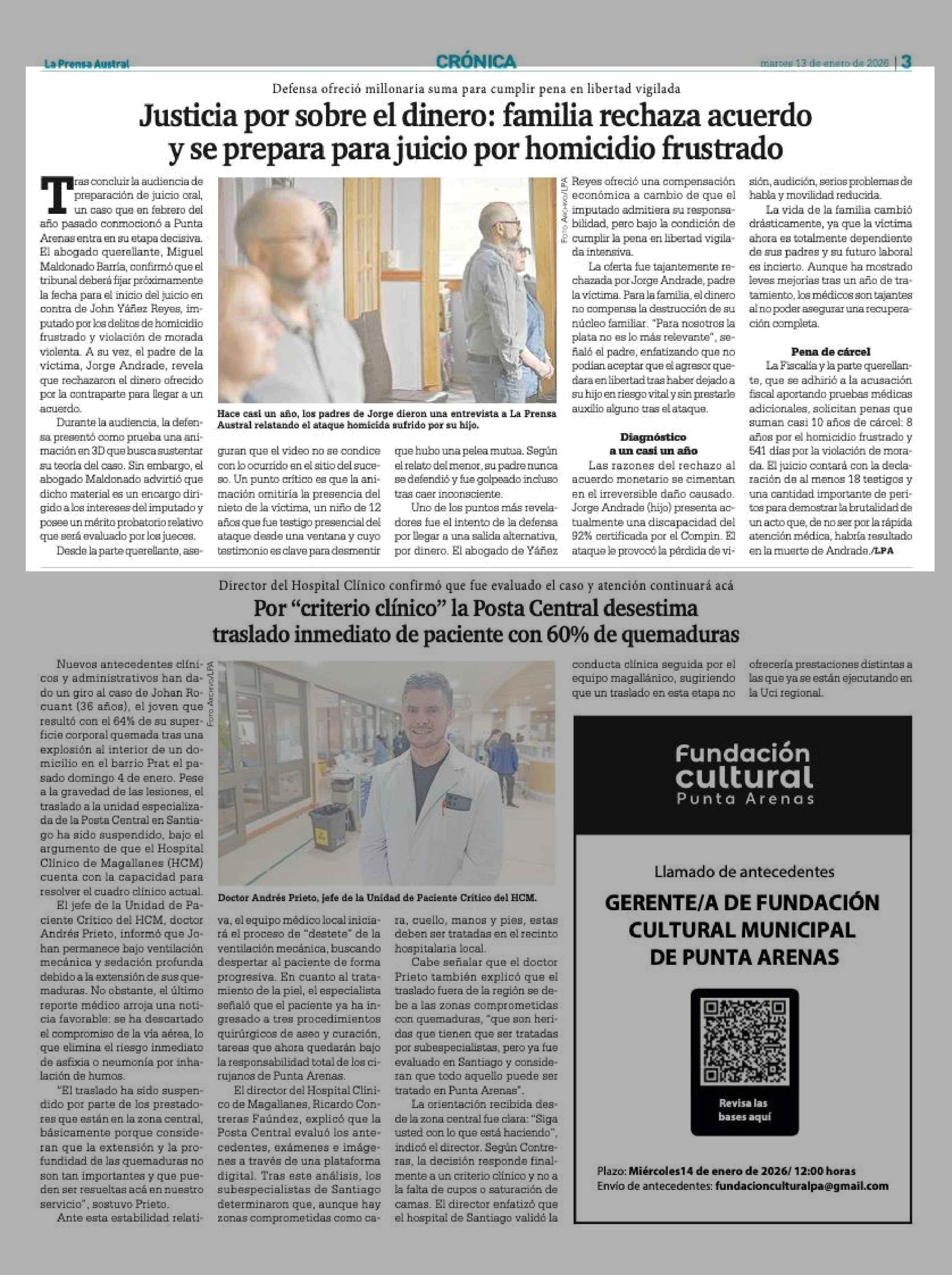 Justicia por sobre el dinero: familia rechaza acuerdo y se prepara para juicio por homicidio frustrado 13-01-2026 La Prensa Austral |