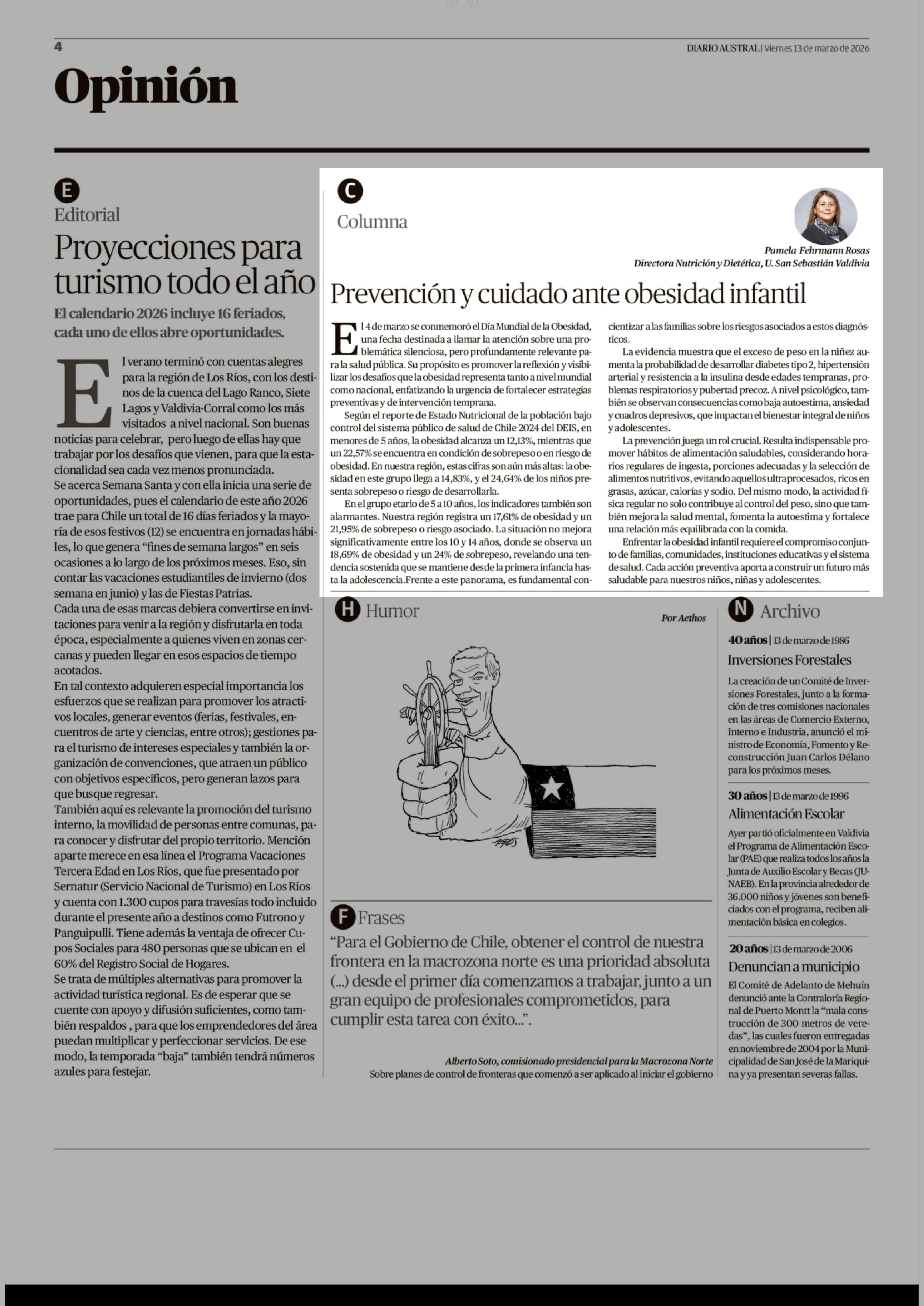 Columnas de Opinión: Prevención y cuidado ante obesidad infantil 13-03-2026 Diario Austral Región de Los Ríos |