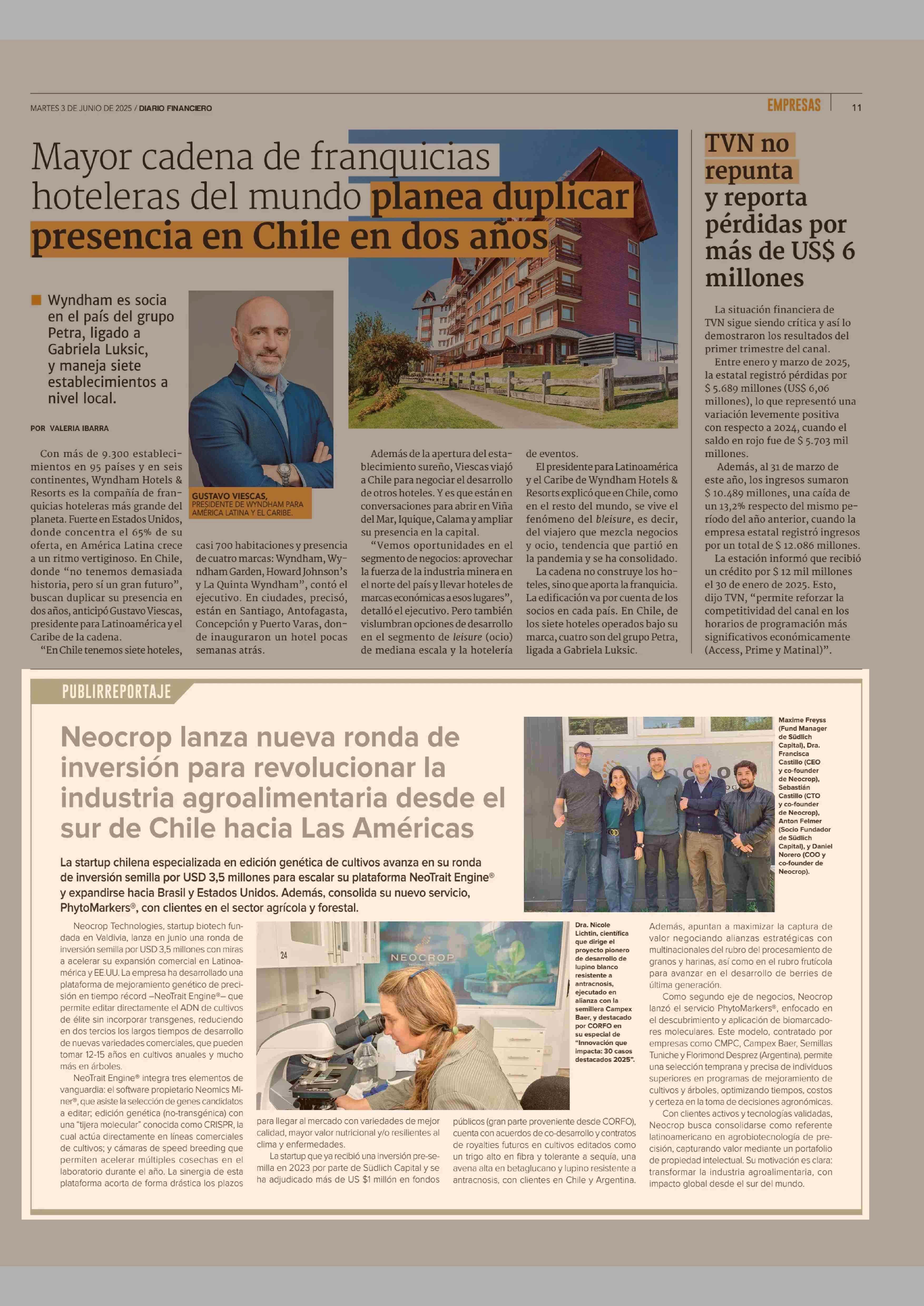 Neocrop lanza nueva ronda de inversión para revolucionar la industria agroalimentaria desde el sur de Chile hacia Las Américas 03-06-2025 Diario Financiero |