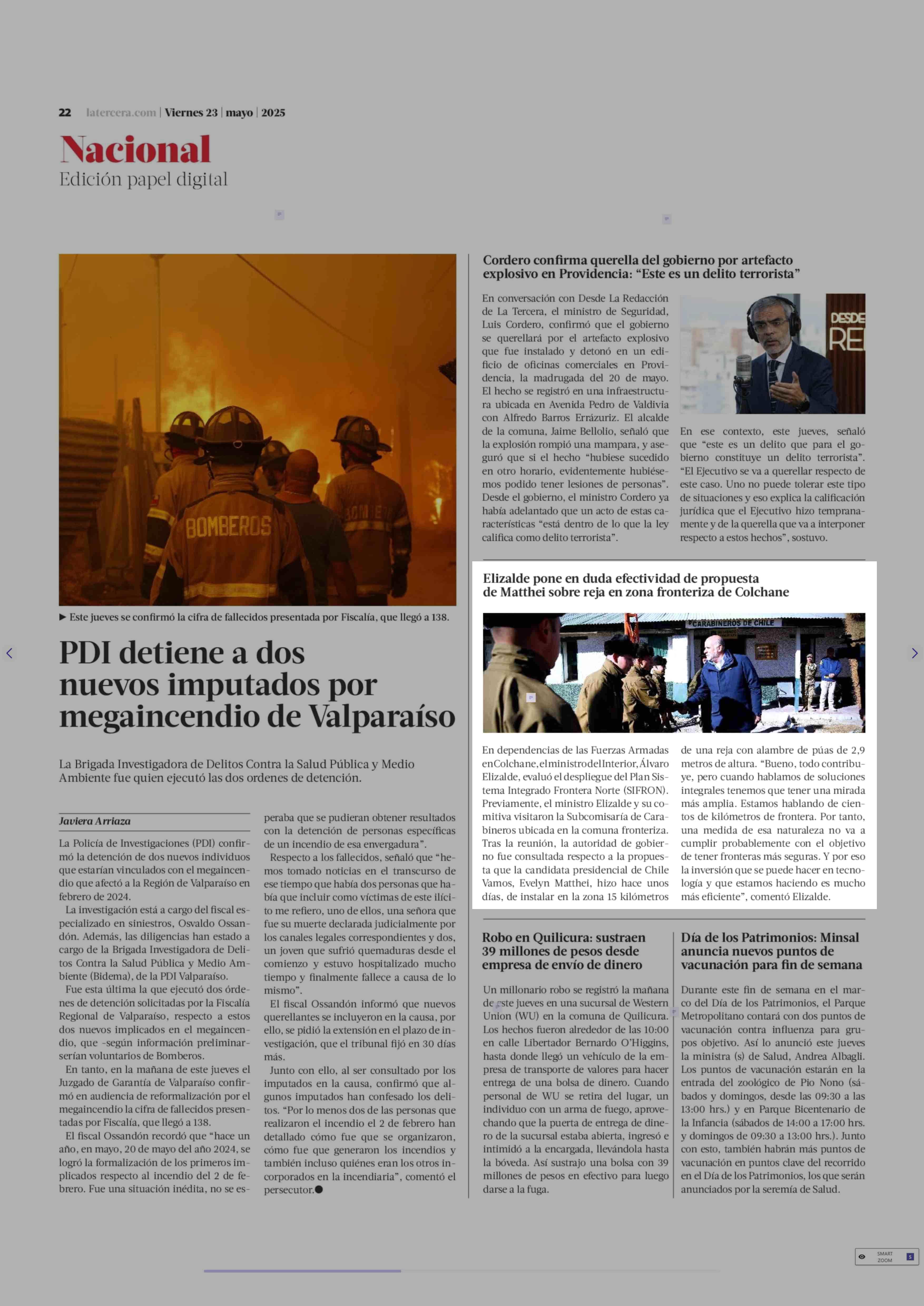 Elizalde pone en duda efectividad de propuesta de Matthei sobre reja en zona fronteriza de Colchane 23-05-2025 La Tercera |