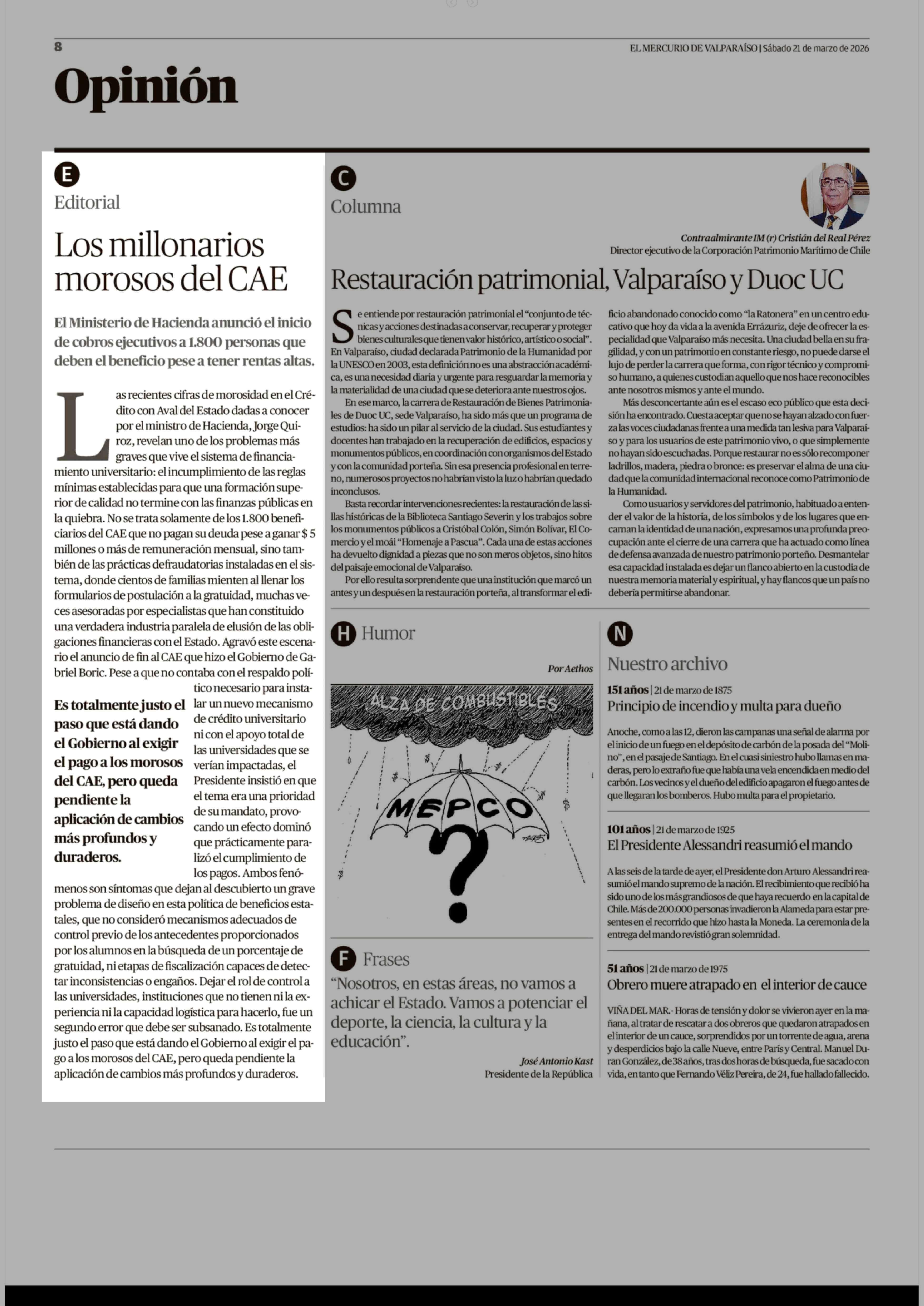 Columnas de Opinión: Los millonarios morosos del CAE 21-03-2026 El Mercurio de Valparaíso |