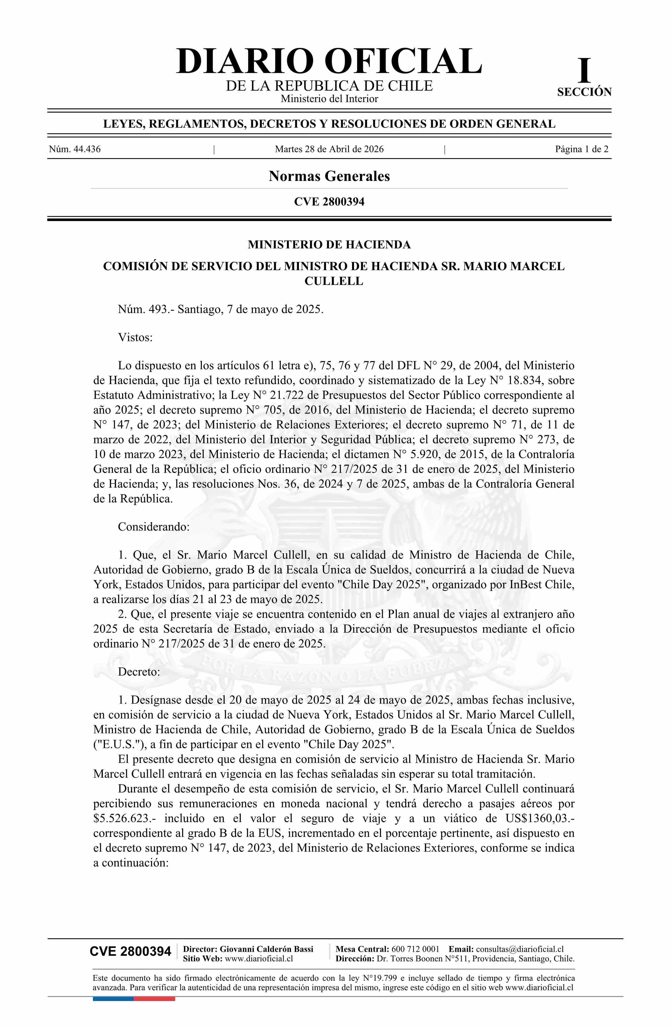 Decreto número 493, de 2025.- Designa en comisión de servicio a don Mario Marcel Cullell, Ministro de Hacienda, a la ciudad de Nueva York, Estados Unidos 28-04-2026 Diario Oficial Edición Electrónica |