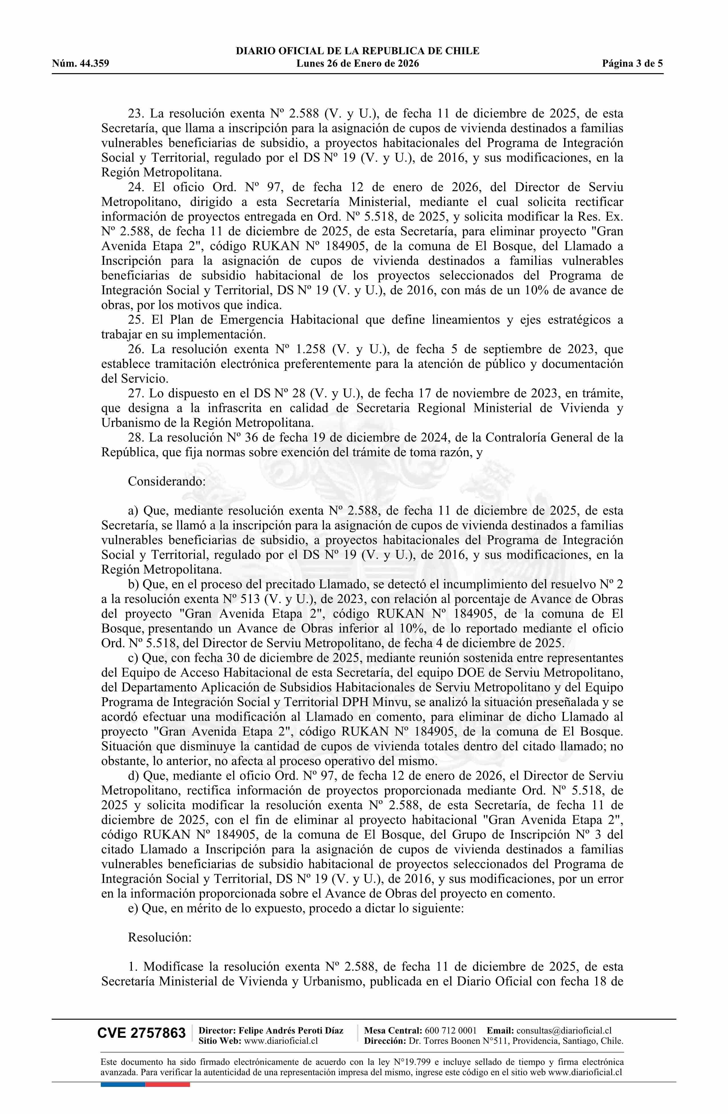 | Título: | Resolución exenta número 42, de 2026.- Modifica resolución Nº 2.588 exenta, de 2025, que llama a inscripción para la asignación de cupos de vivienda destinados a familias vulnerables beneficiarias de subsidio a los proyectos habitacionales seleccionados Pintor José Venturelli de Buin, Condominio Esc |