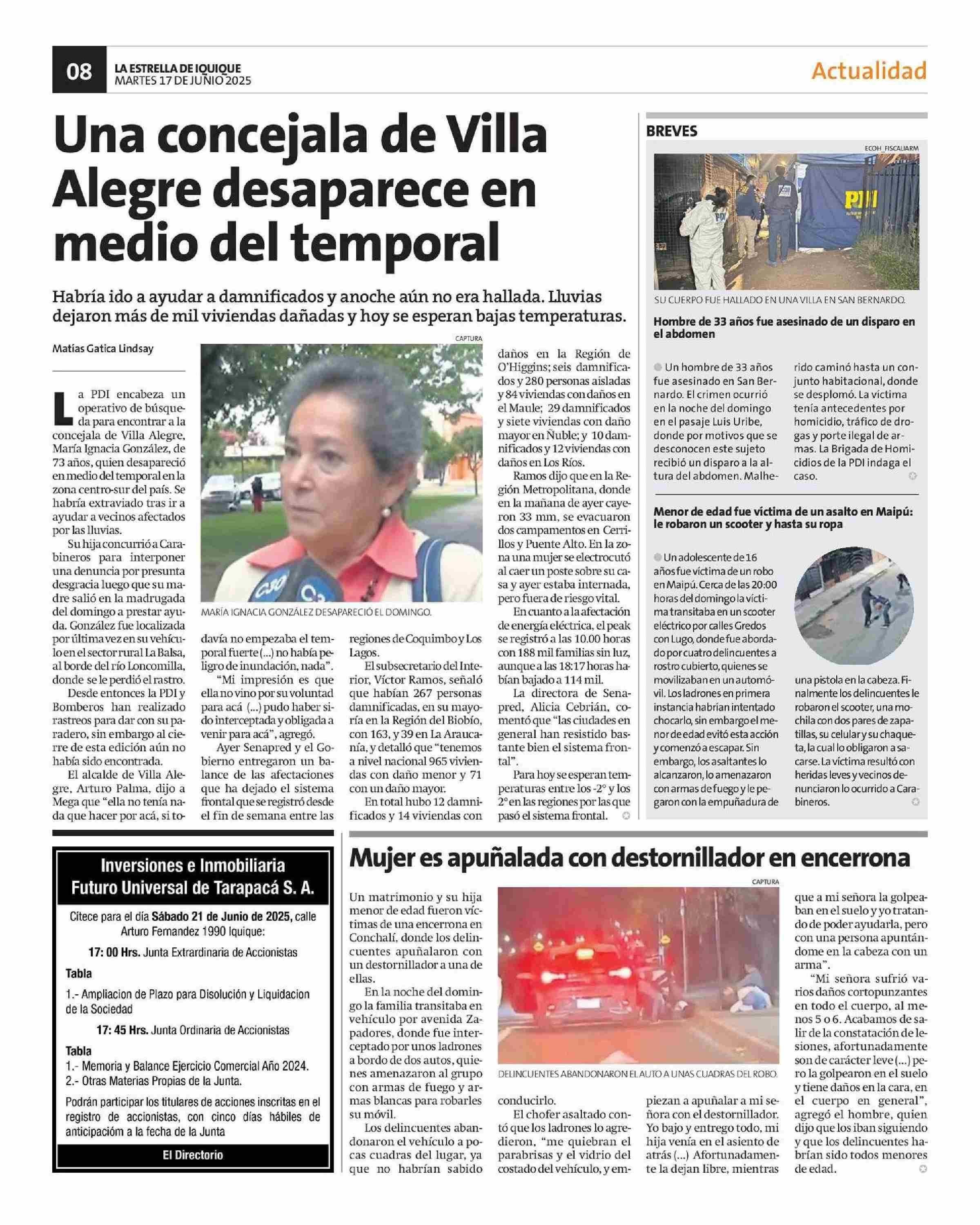 Una concejala de Villa Alegre desaparece en medio del temporal 17-06-2025 La Estrella de Iquique |