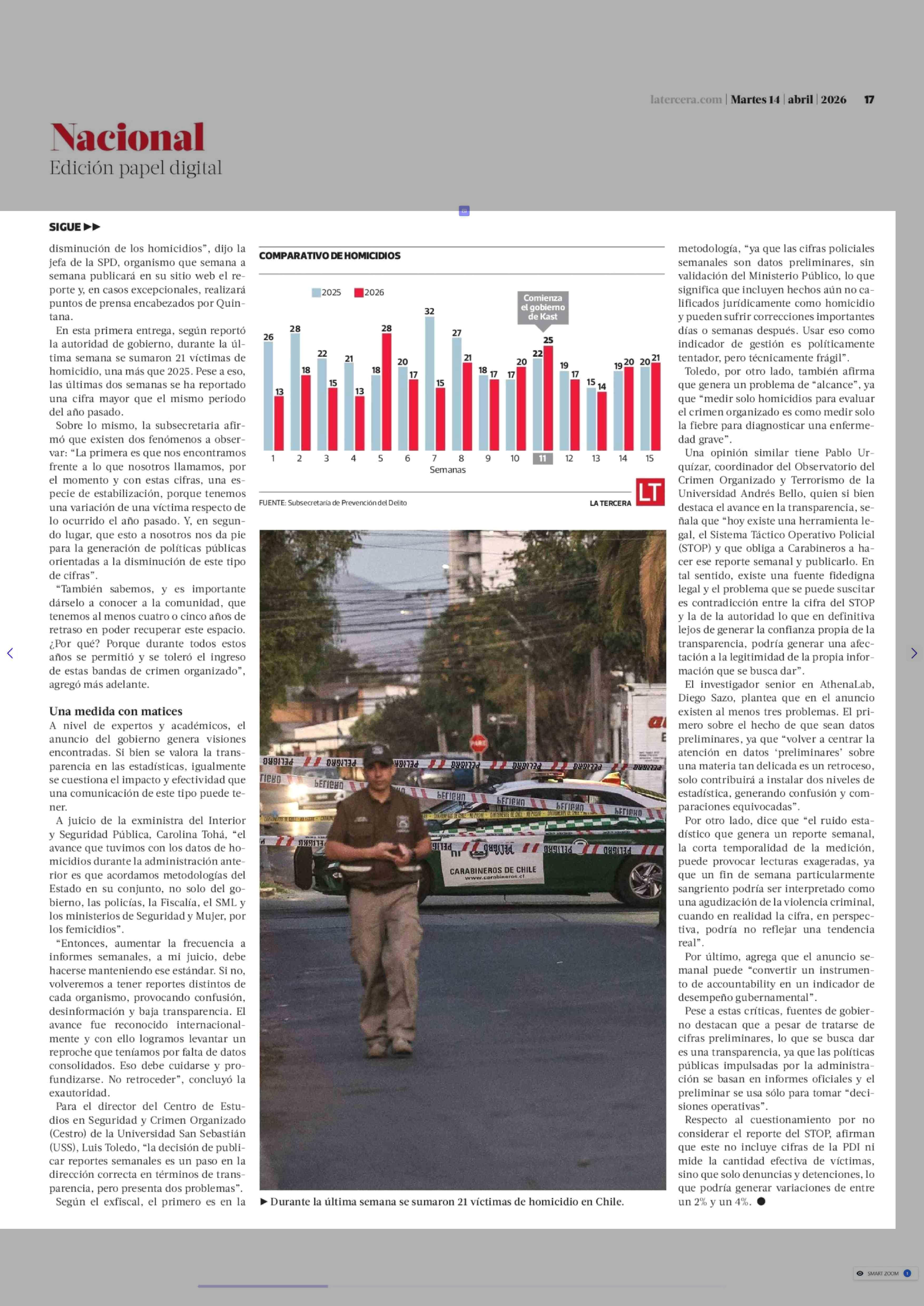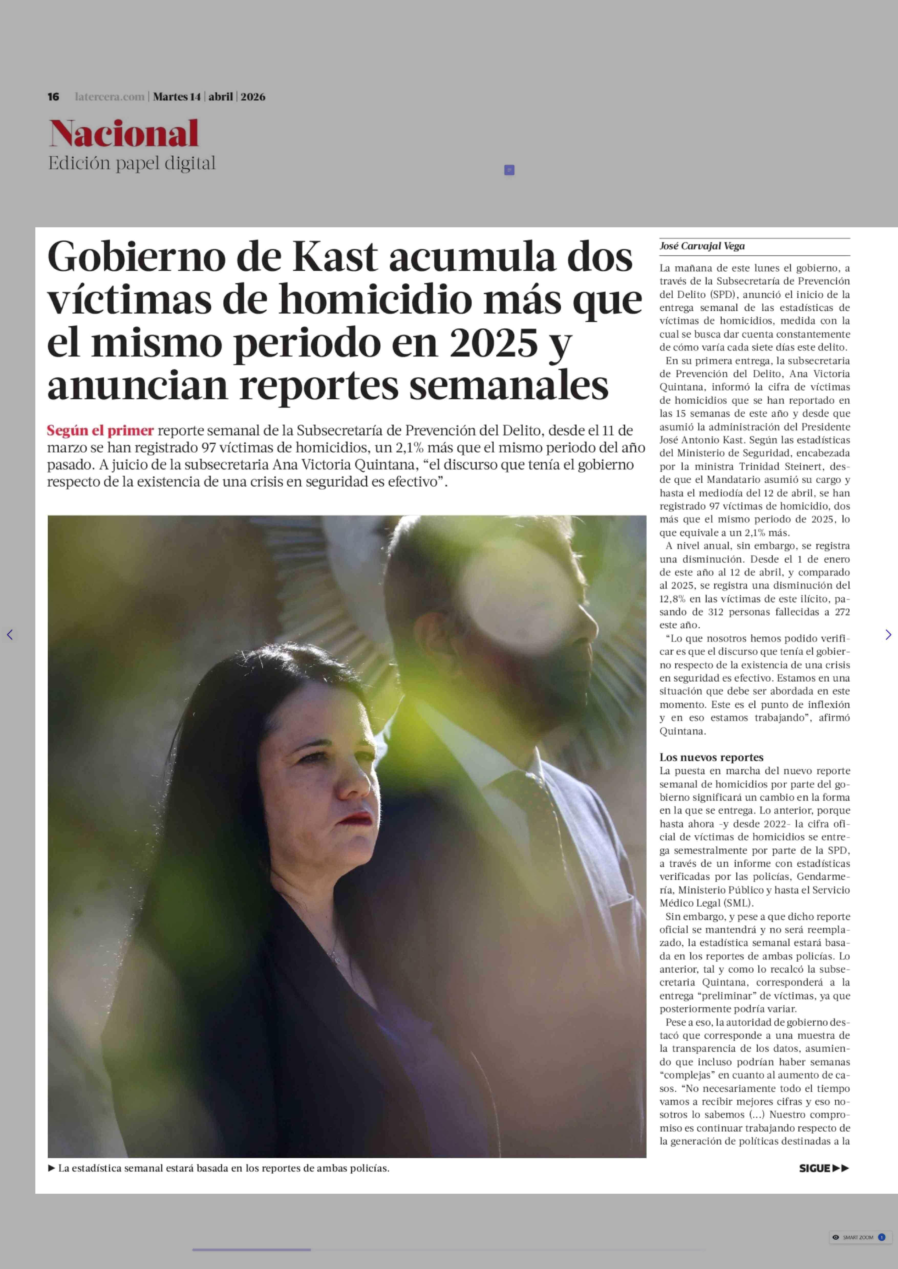 Gobierno de Kast acumula dos víctimas de homicidio más que el mismo periodo en 2025 y anuncian reportes semanales 14-04-2026 La Tercera |