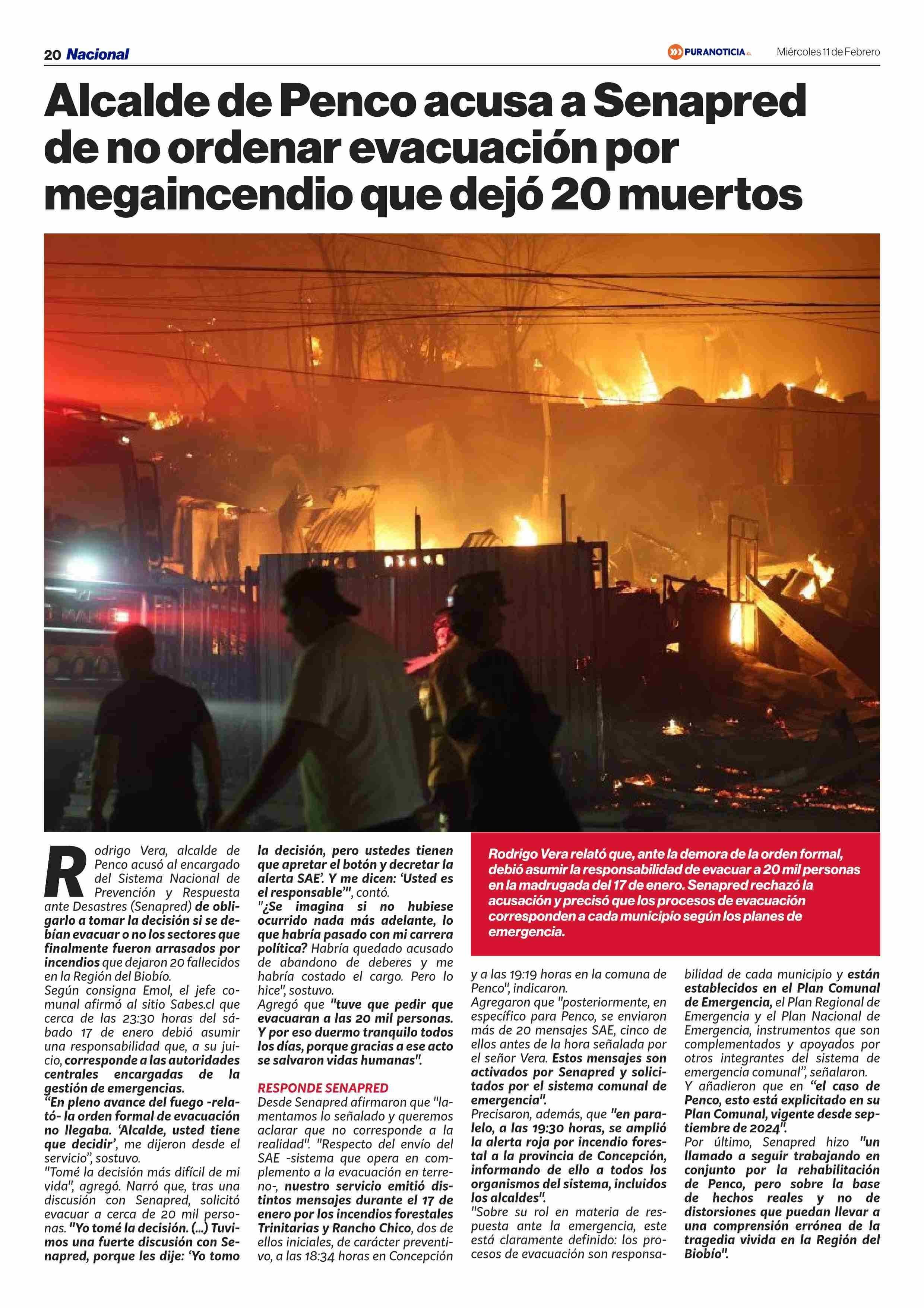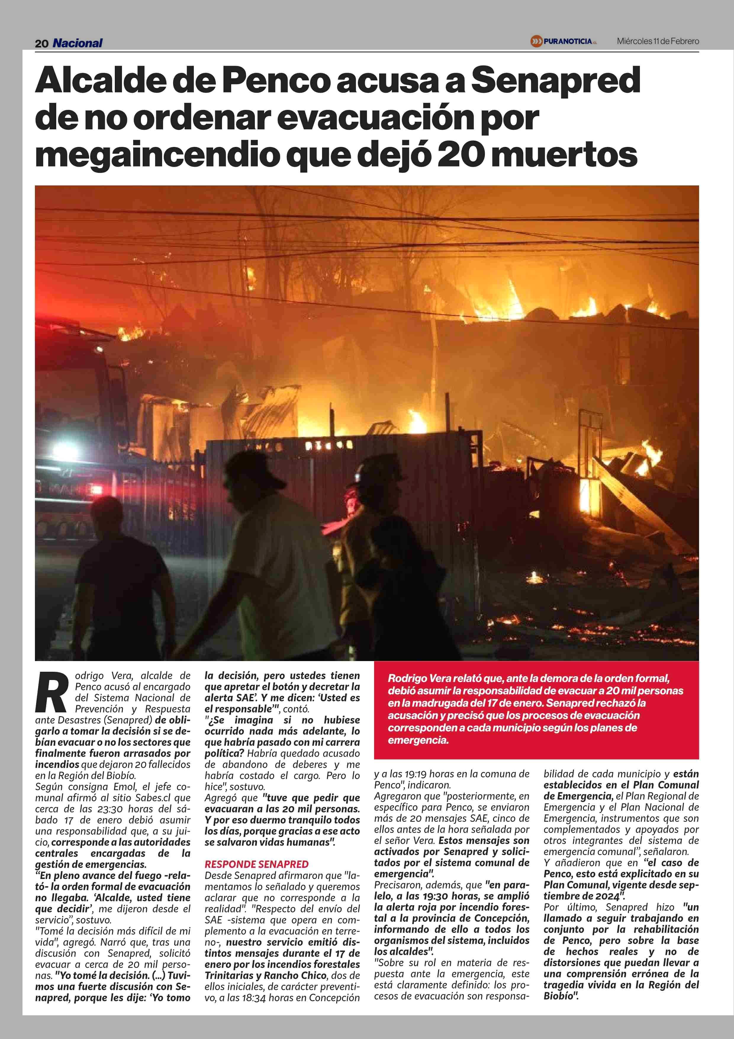 Alcalde de Penco acusa a Senapred de no ordenar evacuación por megaincendio que dejó 20 muertos 11-02-2026 Puranoticia.cl |