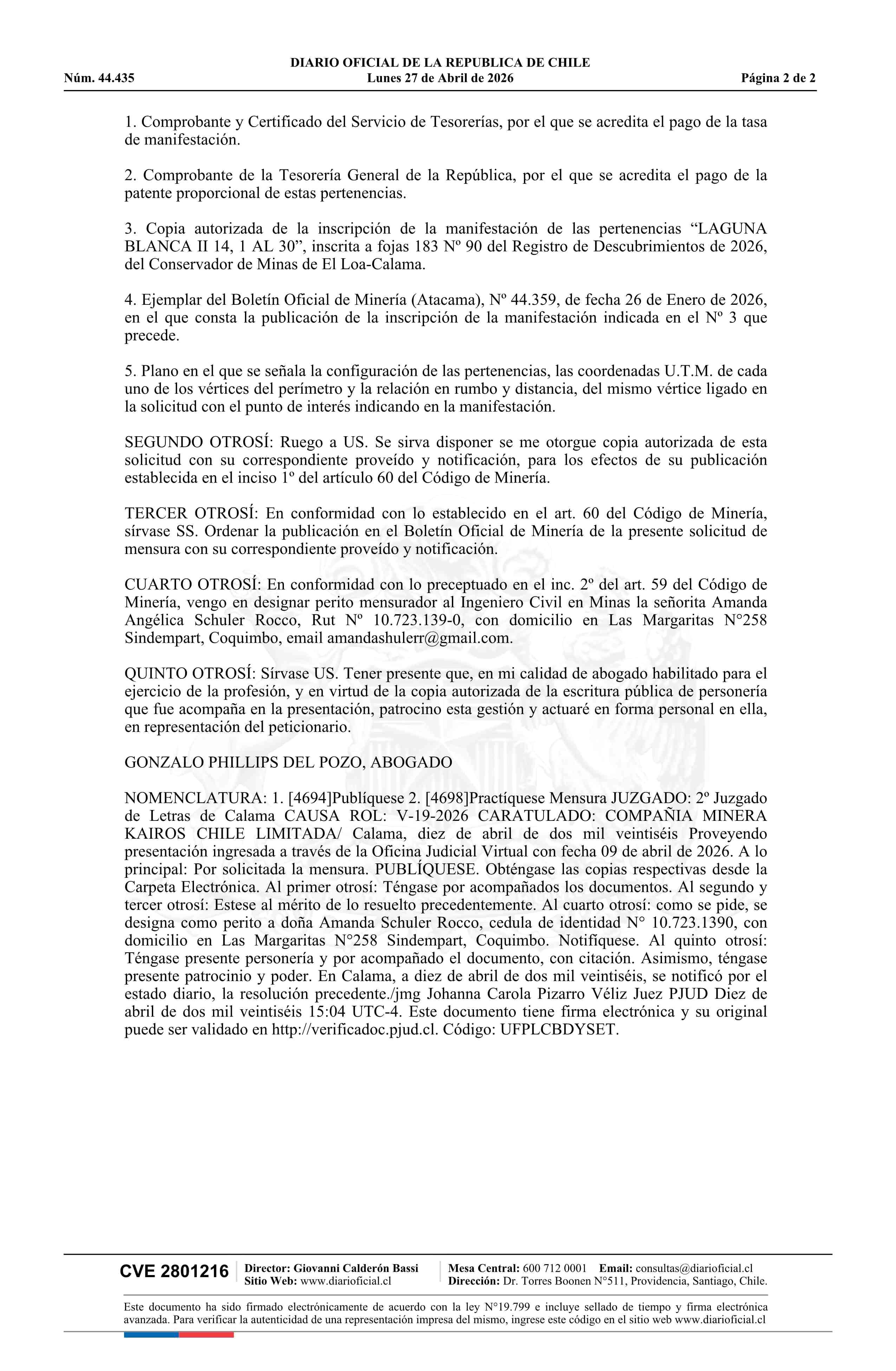LAGUNA BLANCA II 14, 1 AL 30 / Compañía Minera Kairos Chile Limitada 27-04-2026 DIARIO OFICIAL CHILE - BOLETÍN OFICIAL DE MINERÍA |