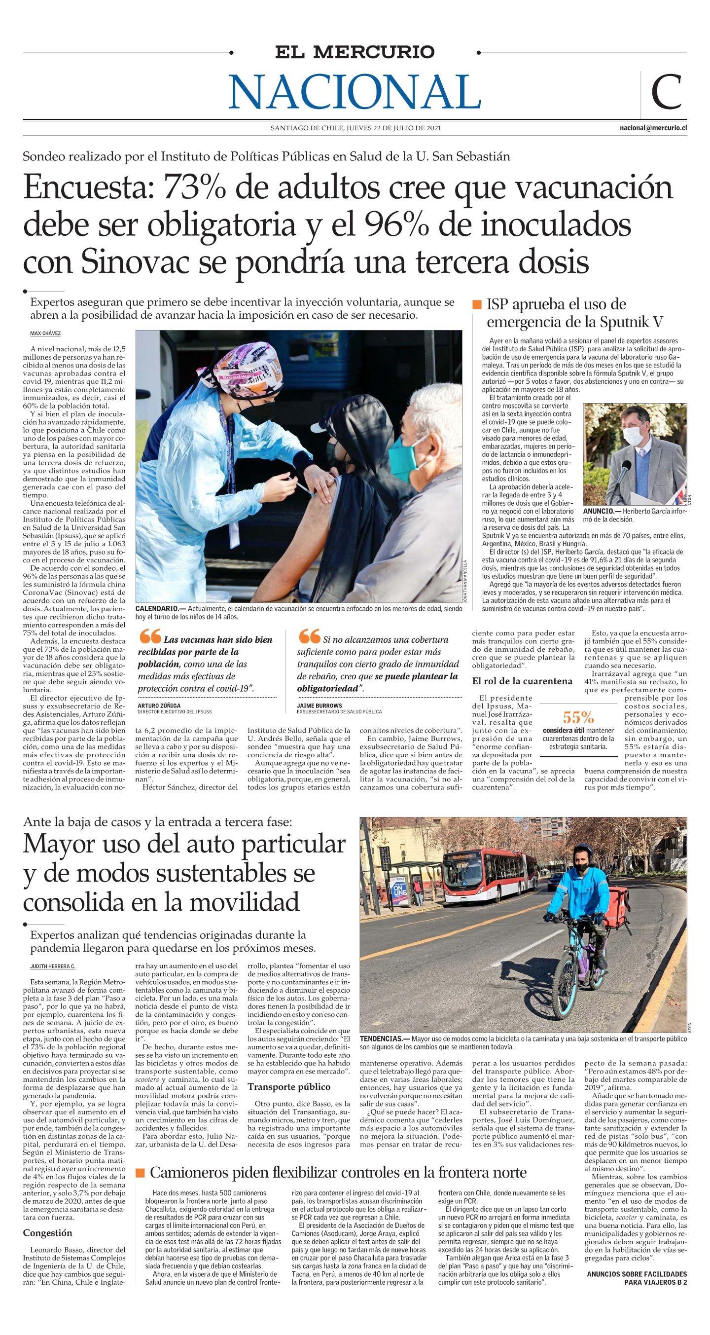 Encuesta: 73% de adultos cree que vacunación debe ser obligatoria y el 96% de inoculados con Sinovac se pondría una tercera dosis 22-07-2021 El Mercurio |