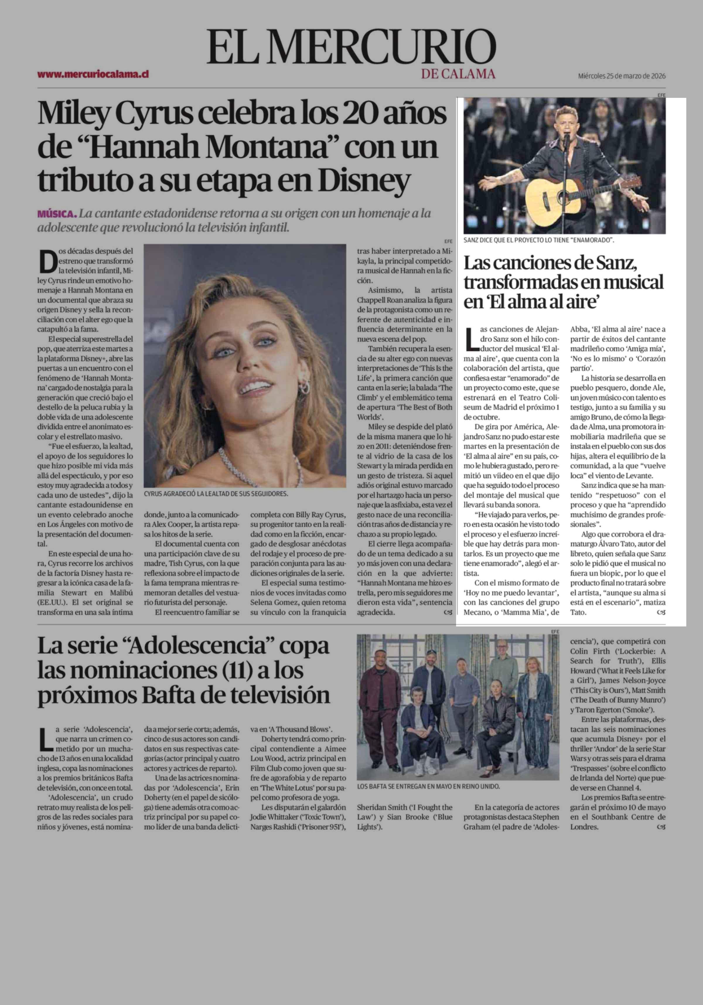 Las canciones de Sanz, transformadas en musical en El alma al aire” 25-03-2026 El Mercurio de Calama |
