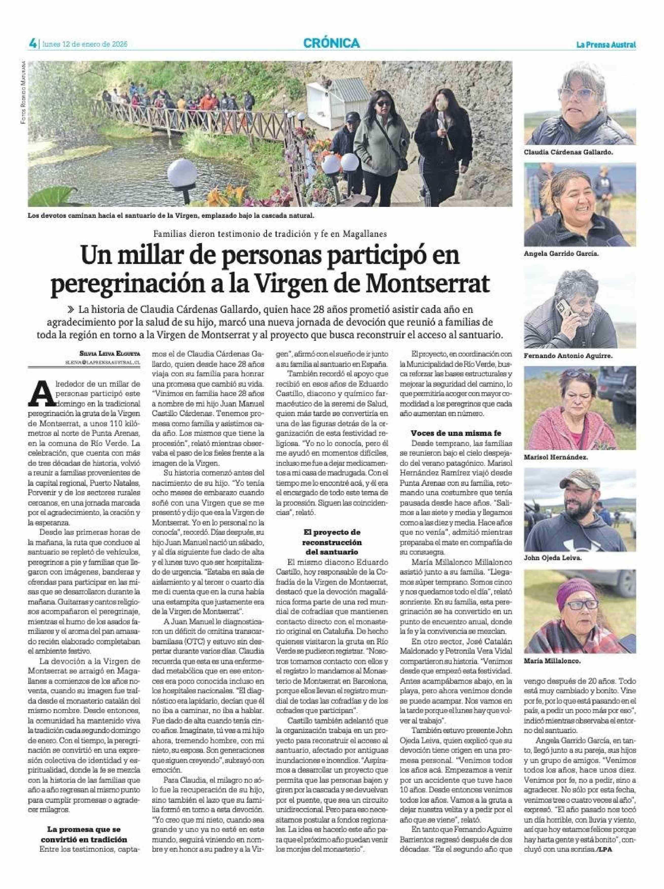 Un millar de personas participó en peregrinación a la Virgen de Montserrat 12-01-2026 La Prensa Austral |