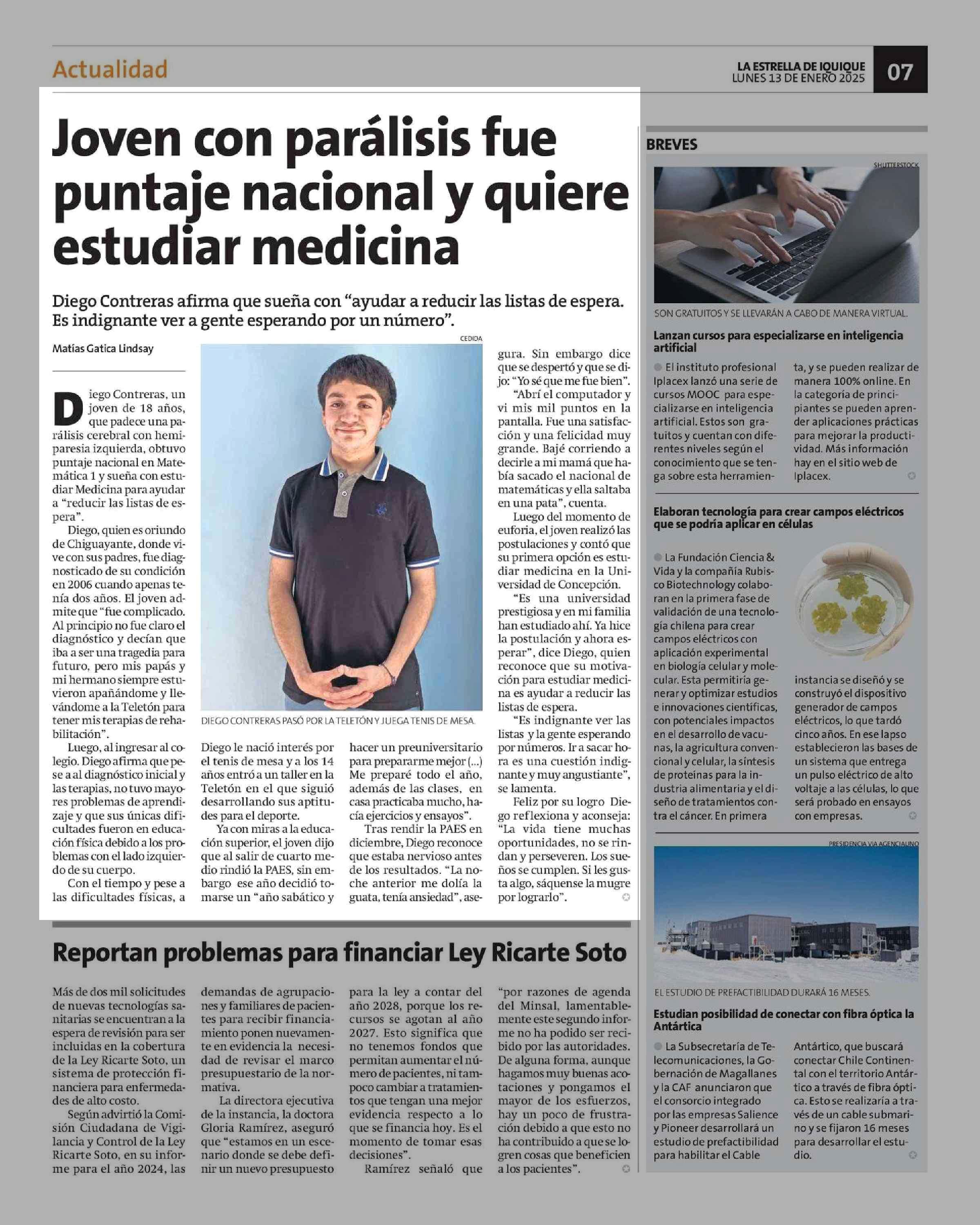 Joven con parálisis fue puntaje nacional y quiere estudiar medicina 13-01-2025 La Estrella de Iquique |
