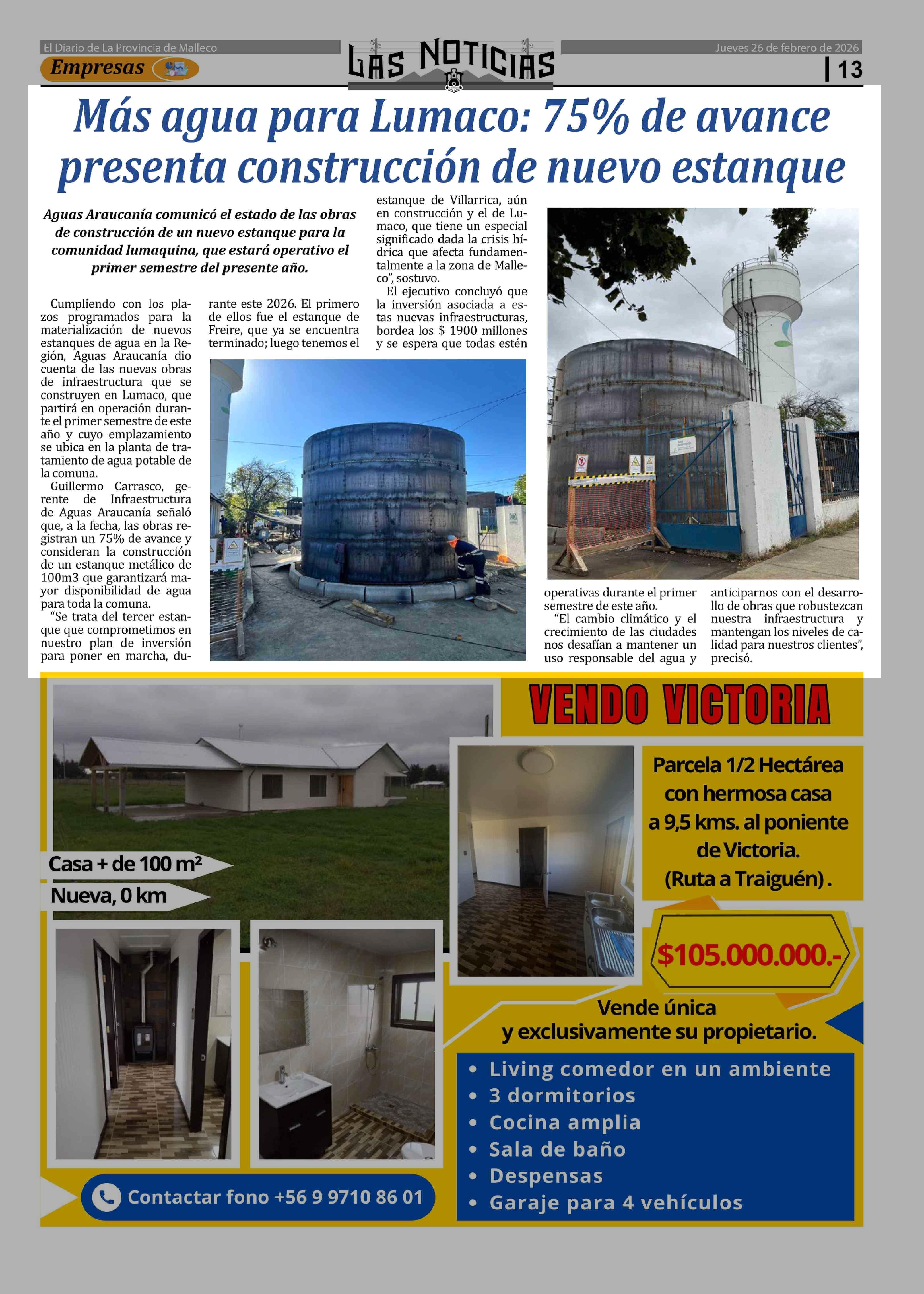 Más agua para Lumaco: 75% de avance presenta construcción de nuevo estanque 26-02-2026 Las Noticias |