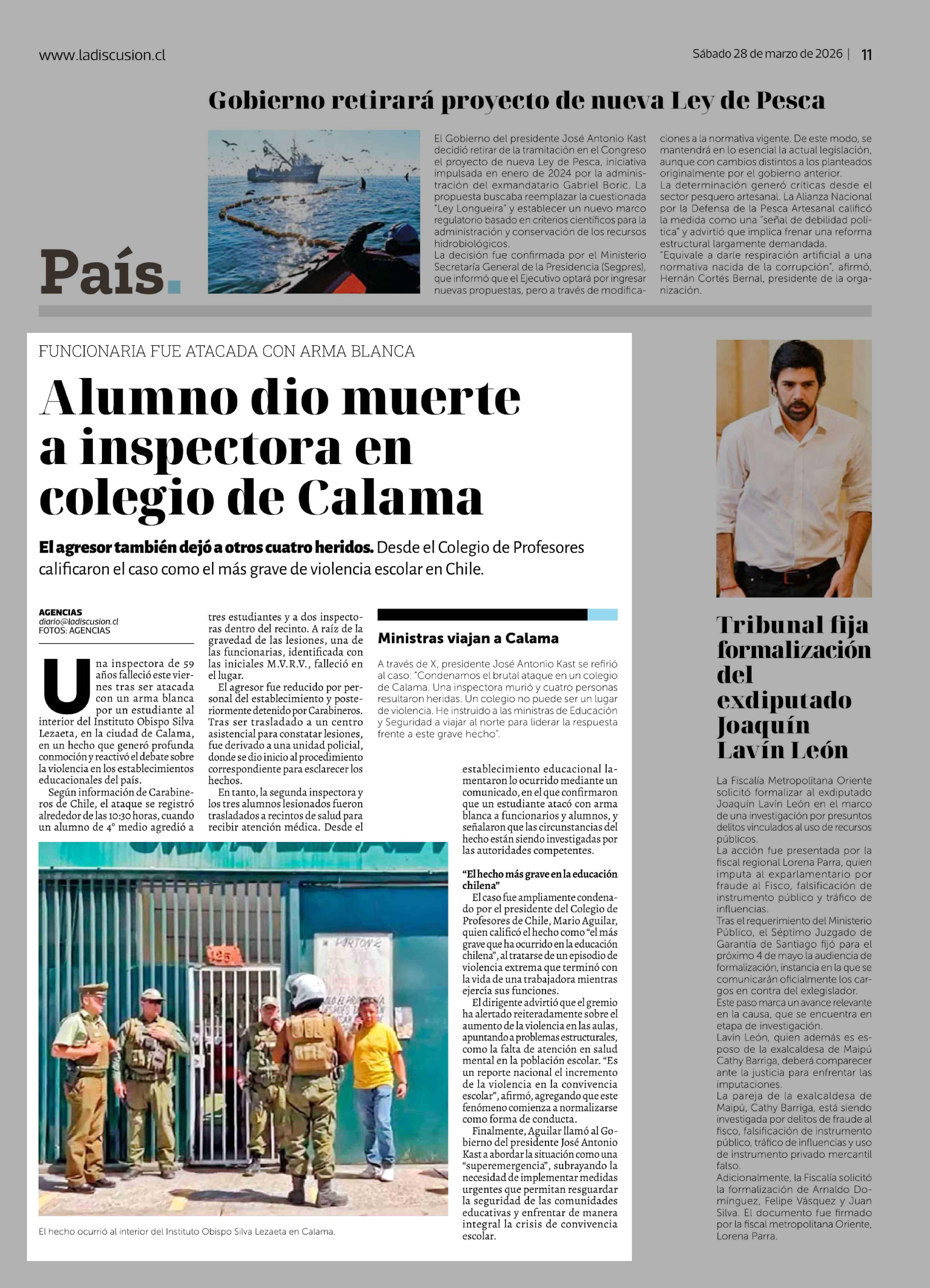 Alumno dio muerte a inspectora en colegio de Calama 28-03-2026 La Discusión |