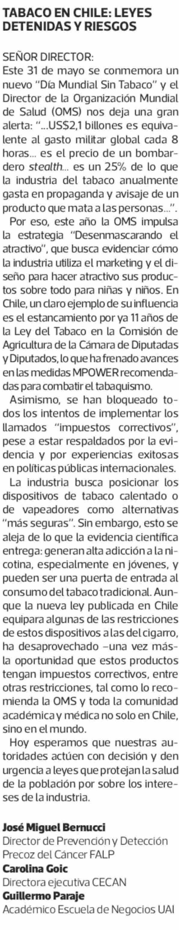 CARTAS: TABACO EN CHILE: LEYES DETENIDAS Y RIESGOS