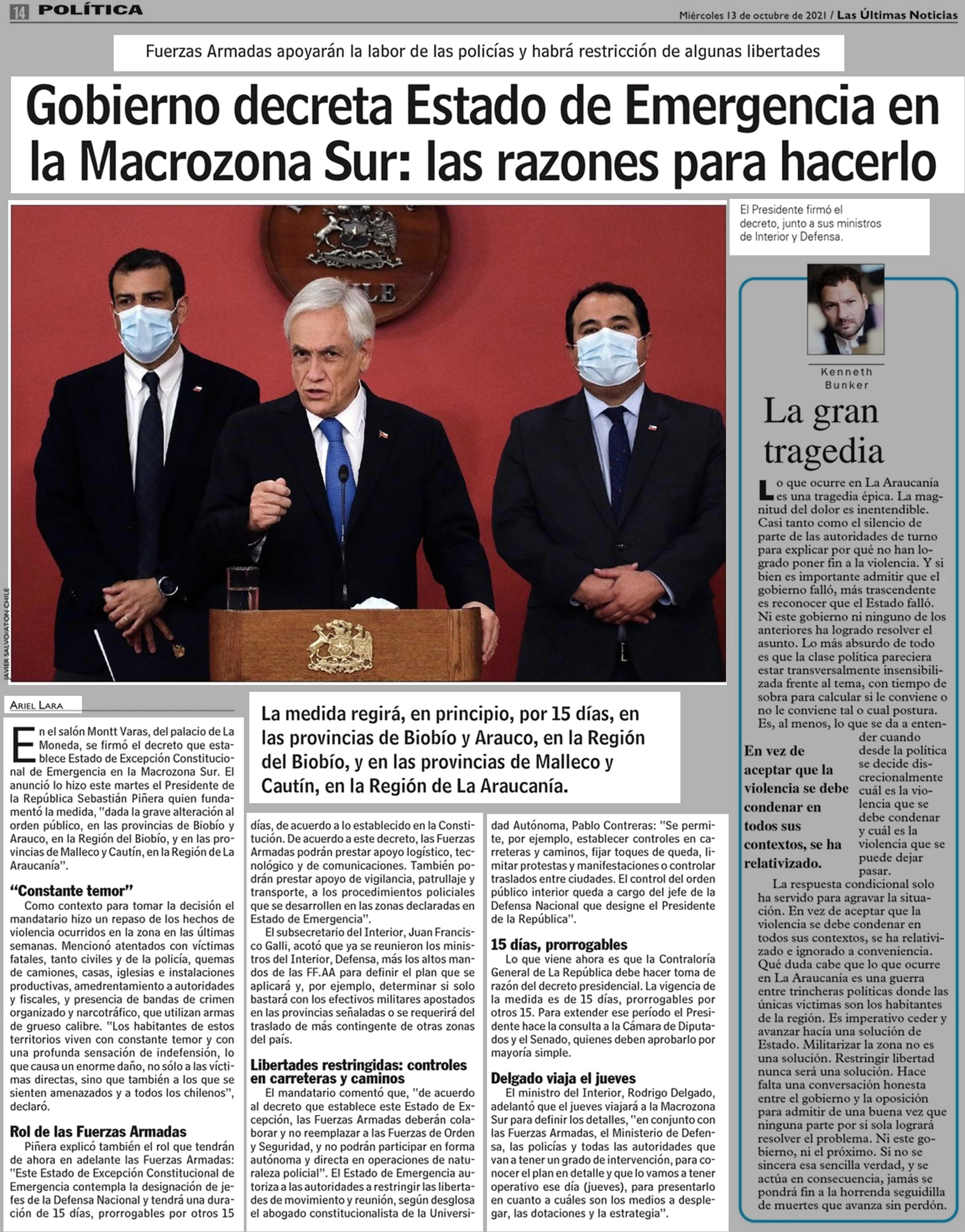 Gobierno decreta Estado de Emergencia en la Macrozona Sur: las razones para hacerlo 13-10-2021 Las Últimas Noticias |