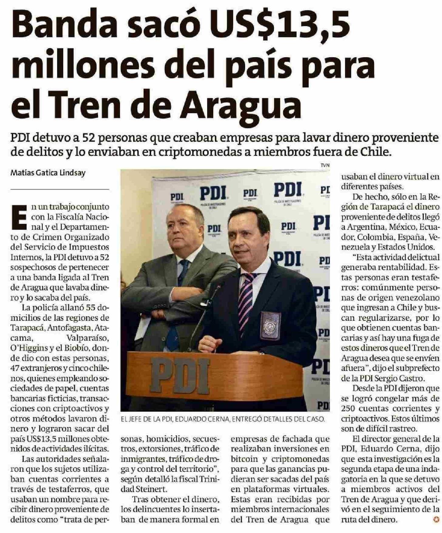 | Título: | Banda sacó US$13,5 millones del país para el Tren de Aragua |