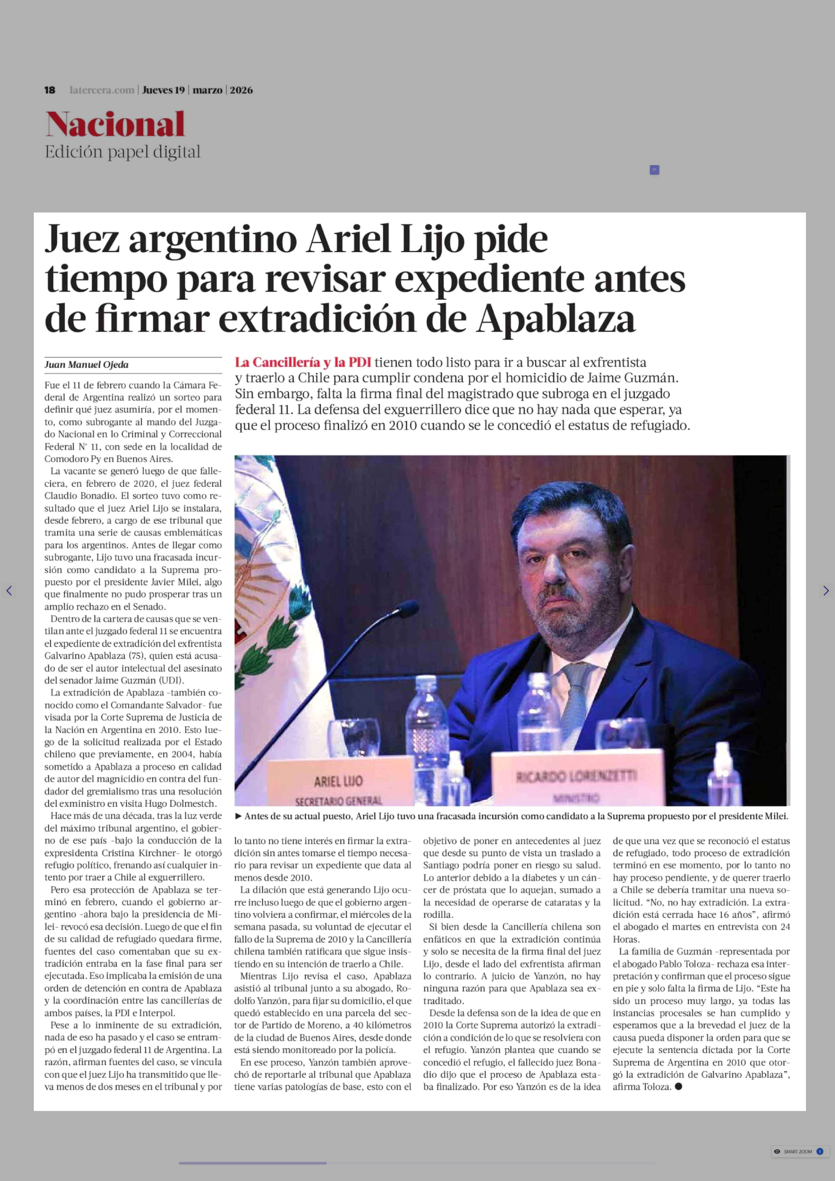 Juez argentino Ariel Lijo pide tiempo para revisar expediente antes de firmar extradición de Apablaza 19-03-2026 La Tercera |