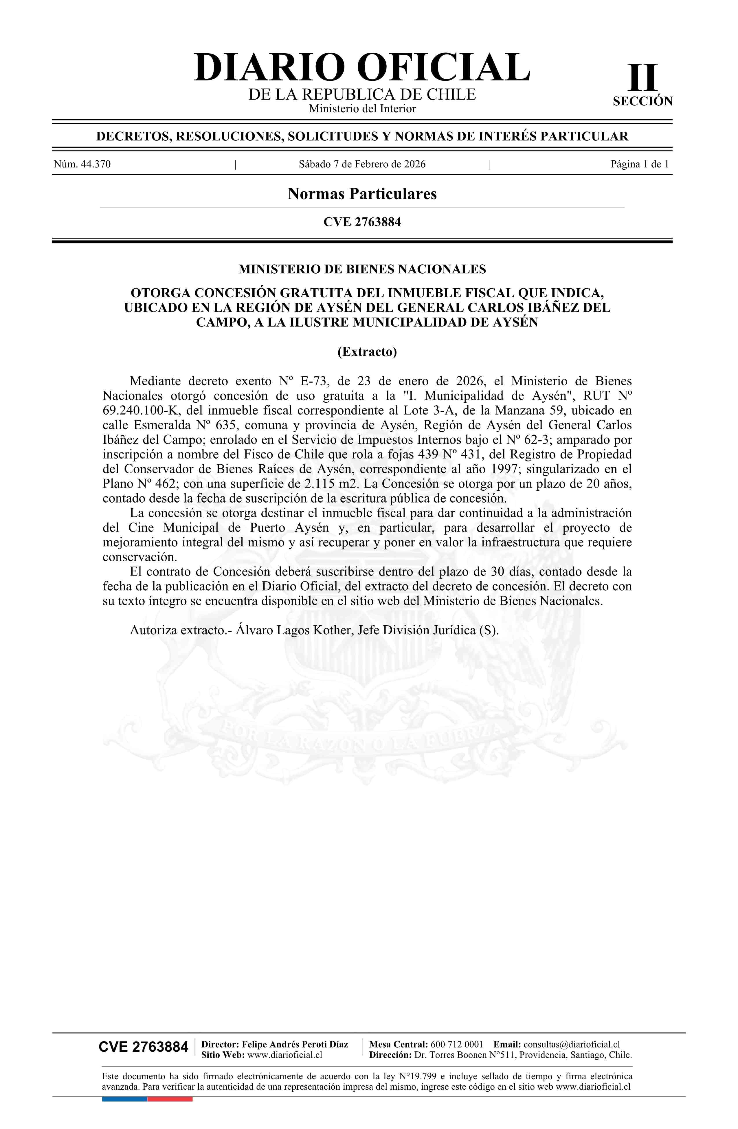 Extracto de decreto exento número E-73, de 2026.- Otorga concesión gratuita del inmueble fiscal que indica, ubicado en la Región de Aysén del General Carlos Ibáñez del Campo, a la Ilustre Municipalidad de Aysén