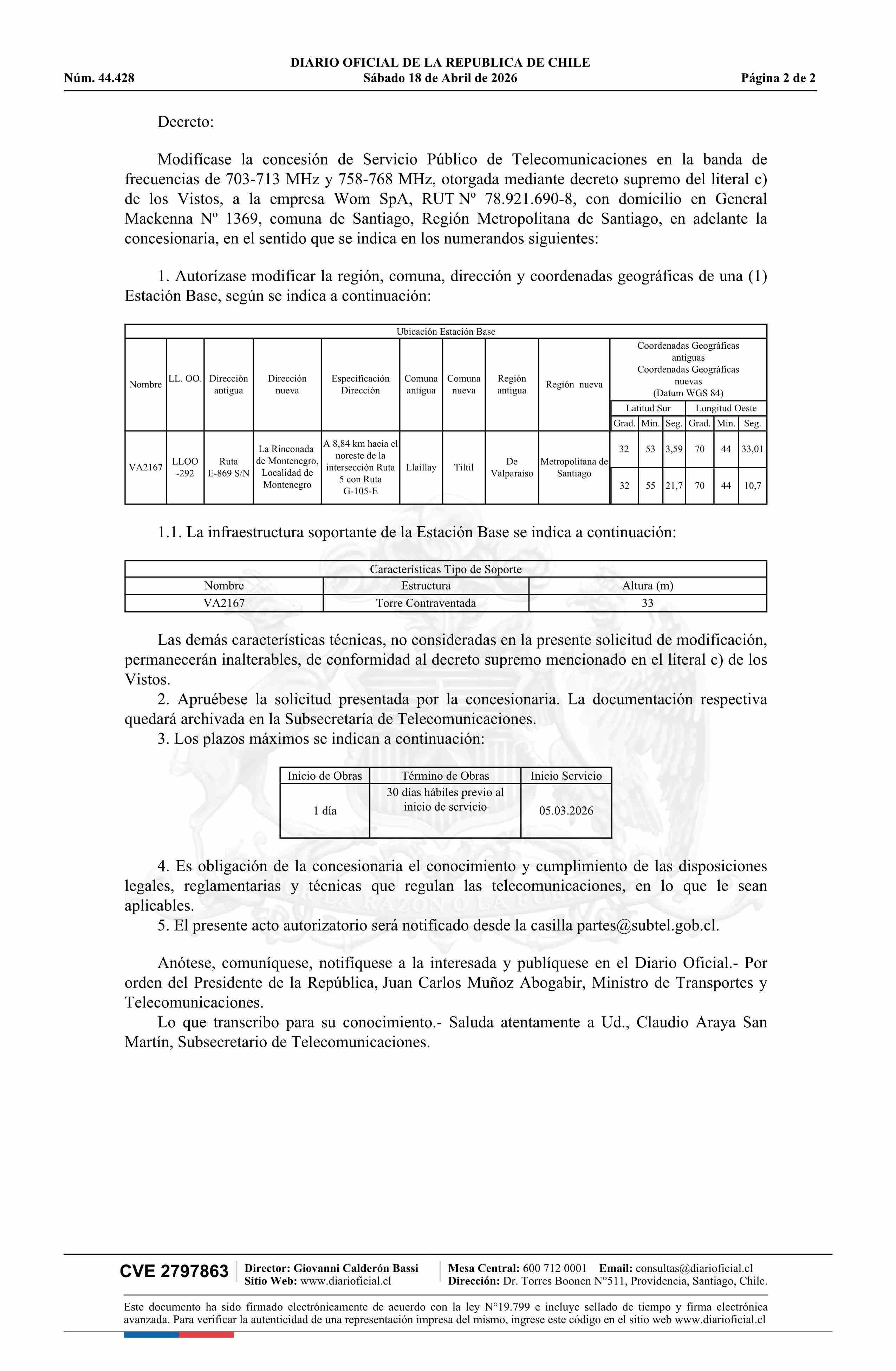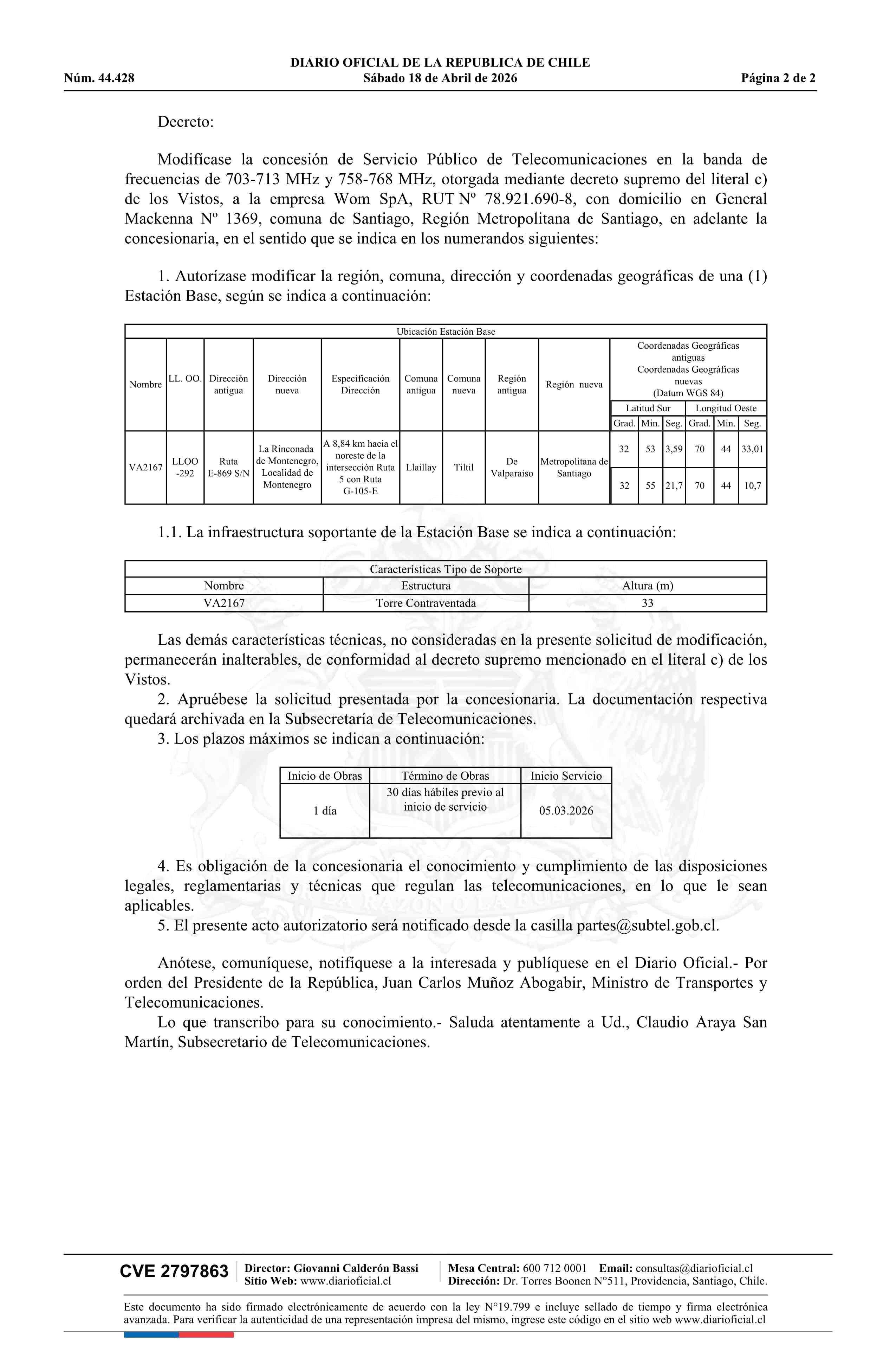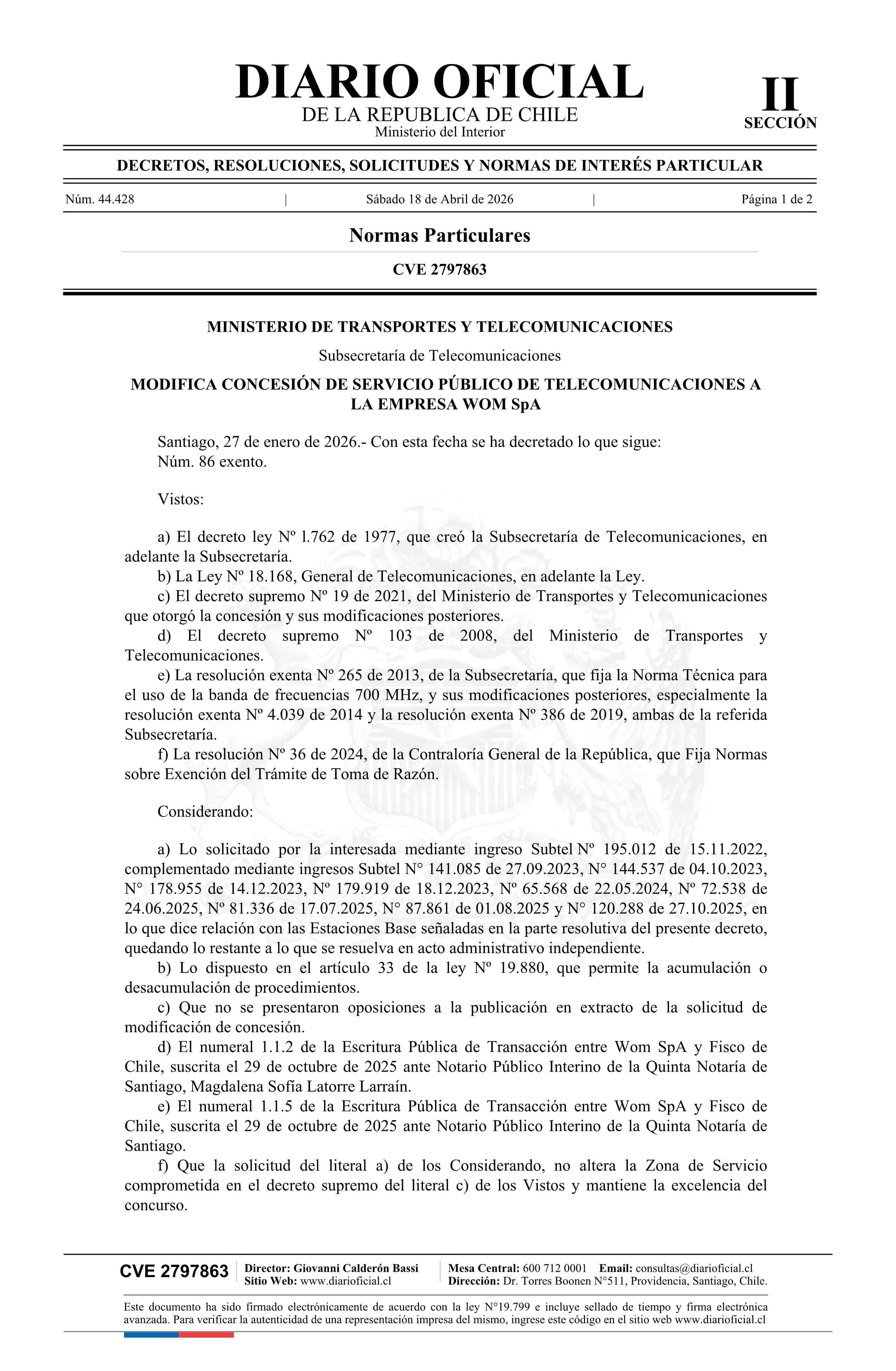 Decreto exento número 86, de 2026.- Modifica concesión de servicio público de telecomunicaciones a la empresa Wom SpA? 18-04-2026 Diario Oficial Edición Electrónica |