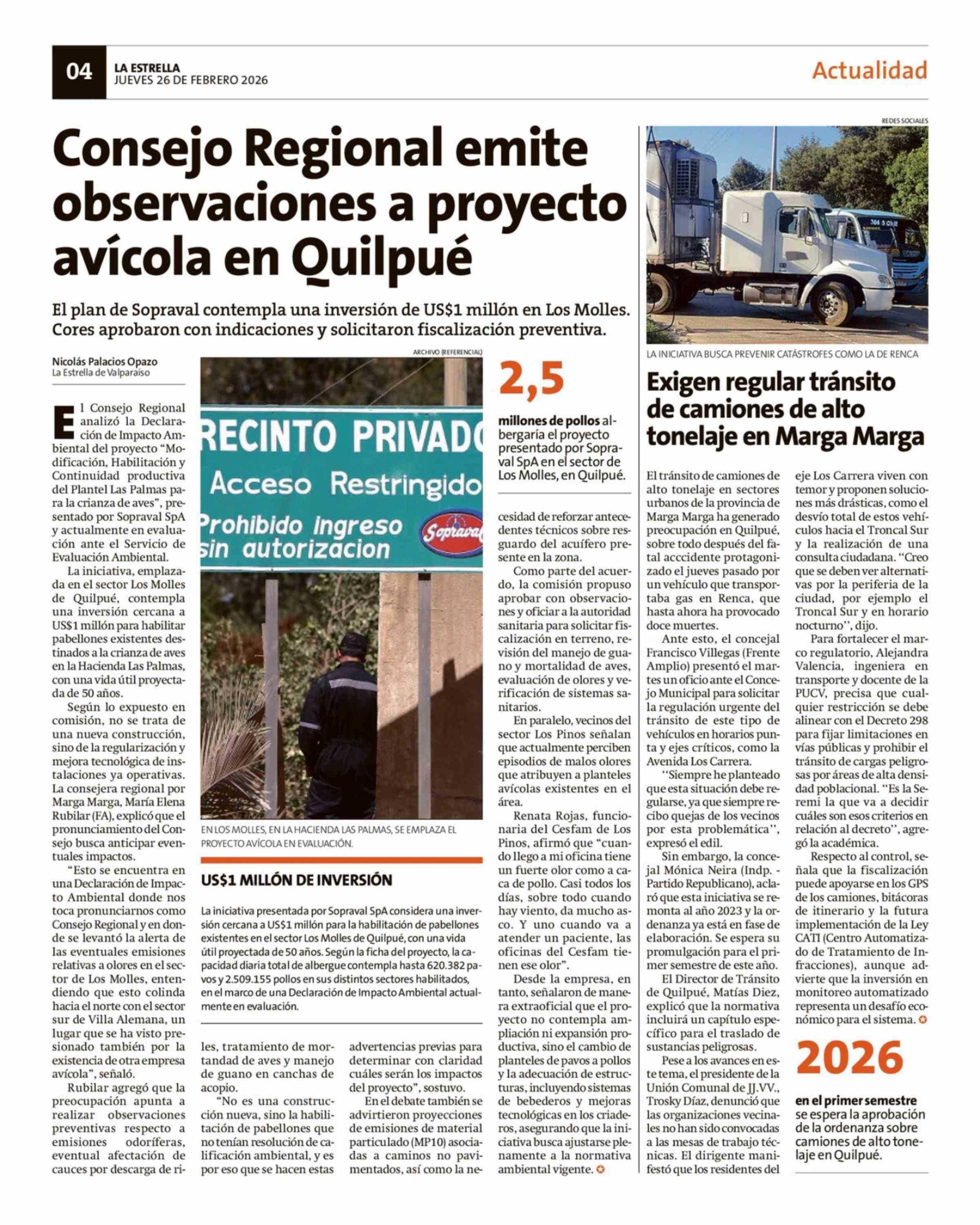 Exigen regular tránsito de camiones de alto tonelaje en Marga Marga 26-02-2026 La Estrella de Valparaíso |