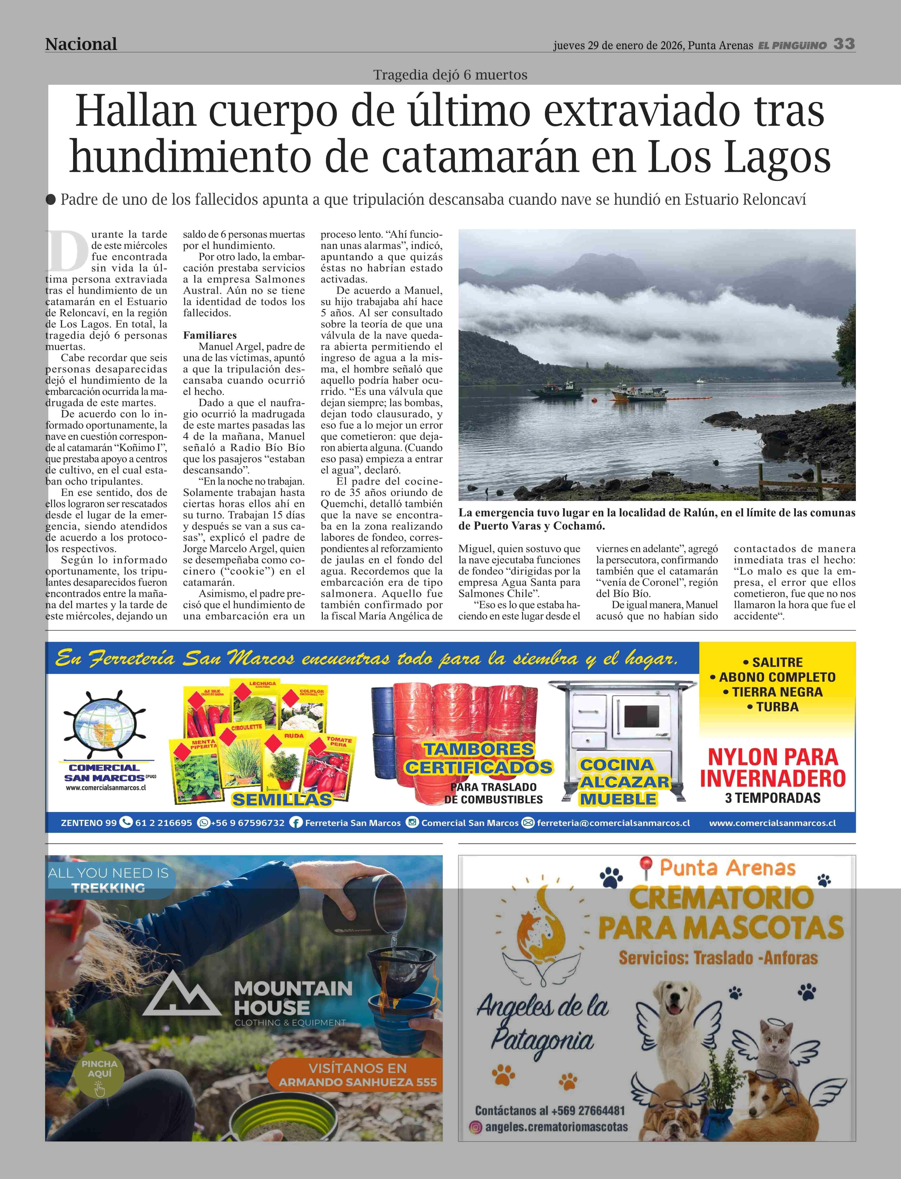 Hallan cuerpo de último extraviado tras hundimiento de catamarán en Los Lagos 29-01-2026 El Pingüino |