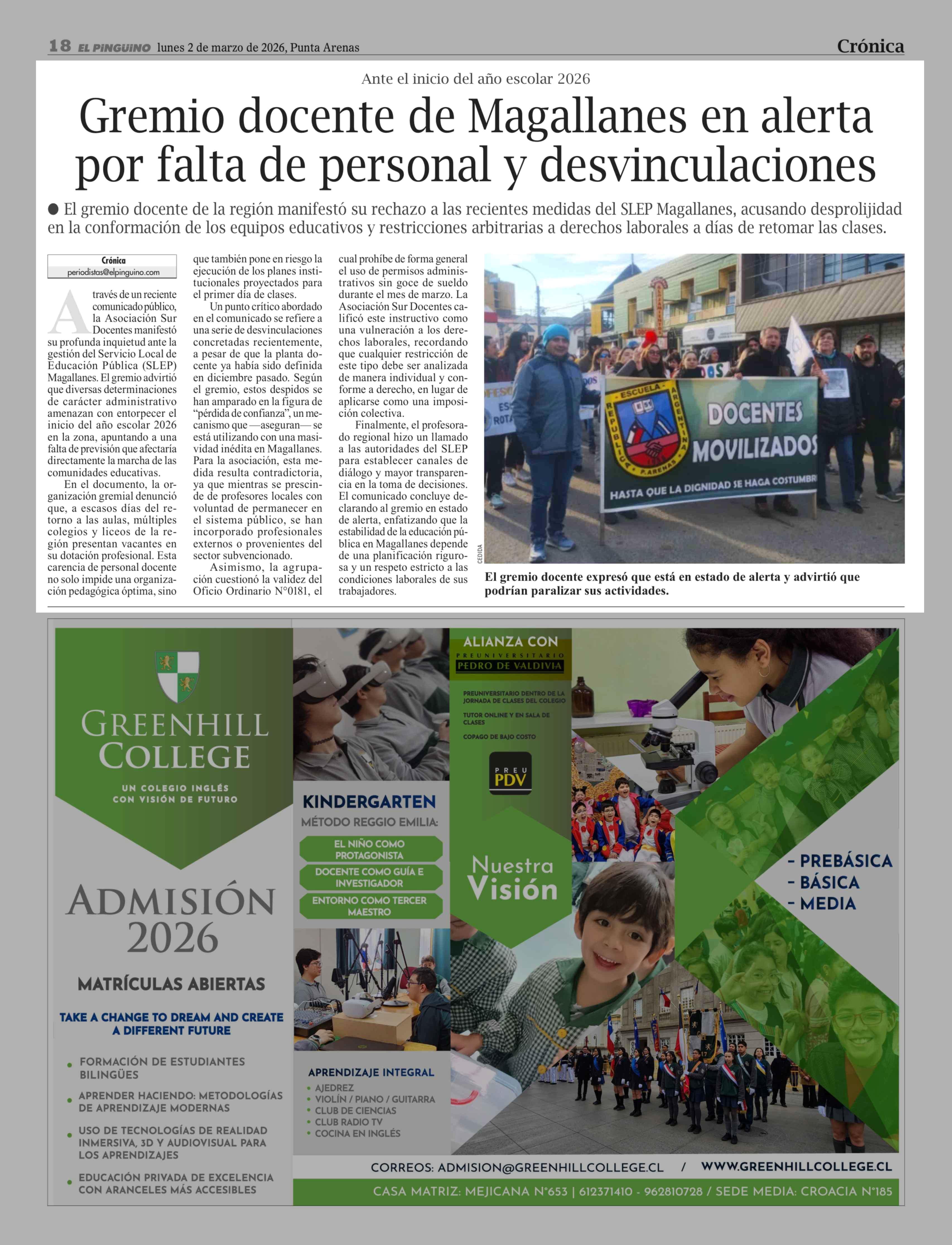 Título: Gremio docente de Magallanes en alerta por falta de personal y desvinculaciones
