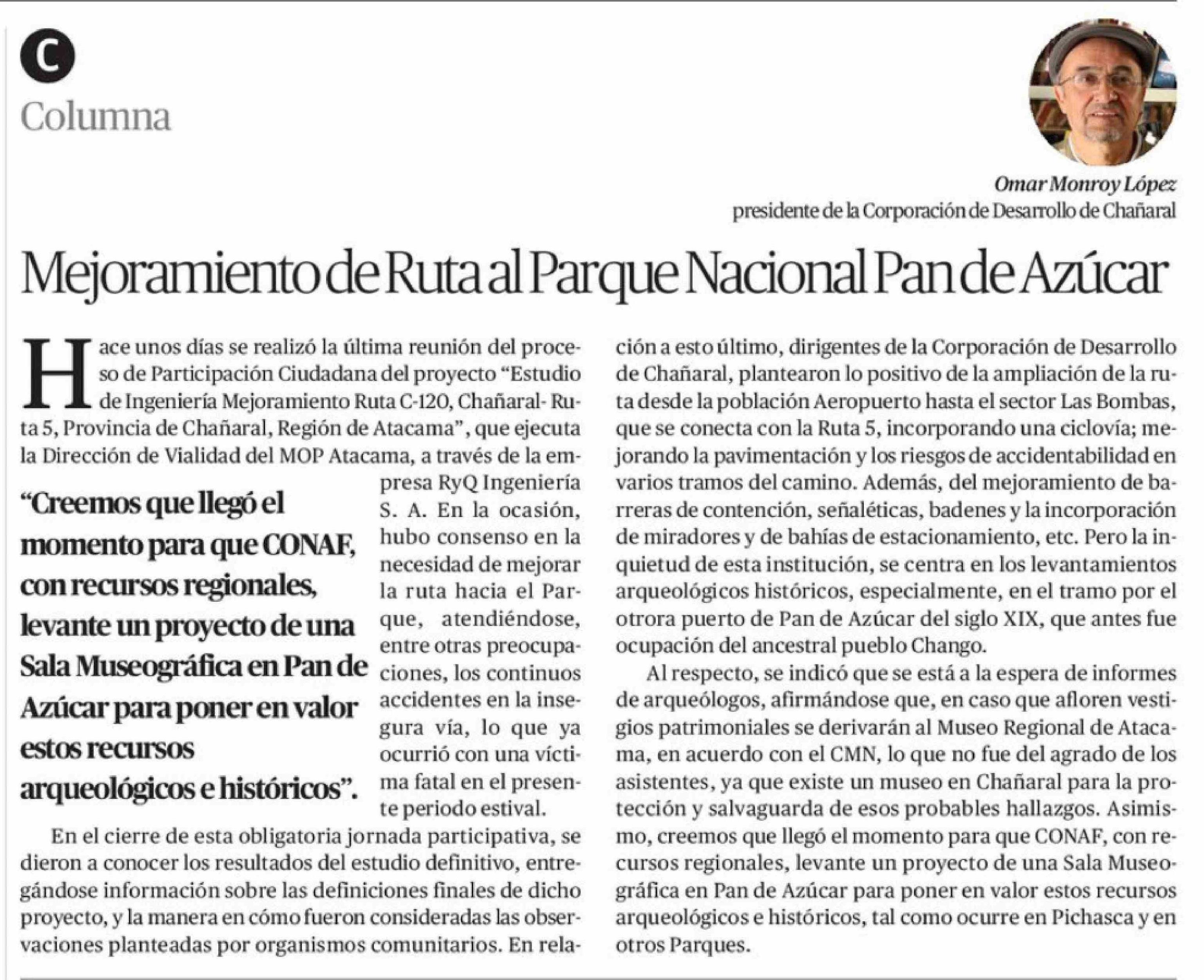 Columnas de Opinión: Mejoramiento de Ruta al Parque Nacional Pan de Azúcar 11-02-2026 El Diario de Atacama |