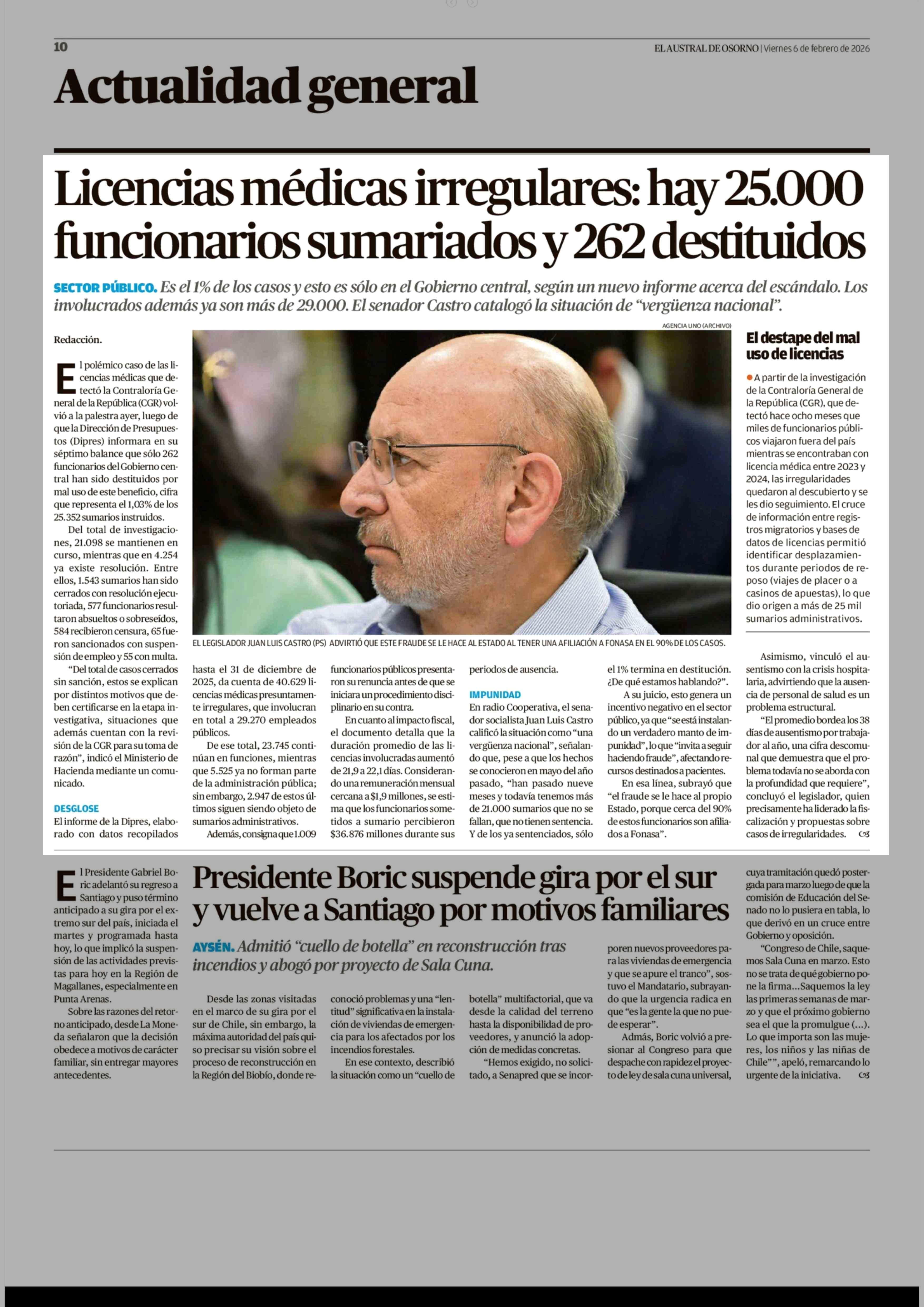 Licencias médicas irregulares: hay 25.000 funcionarios sumariados y 262 destituidos 06-02-2026 El Austral de Osorno |