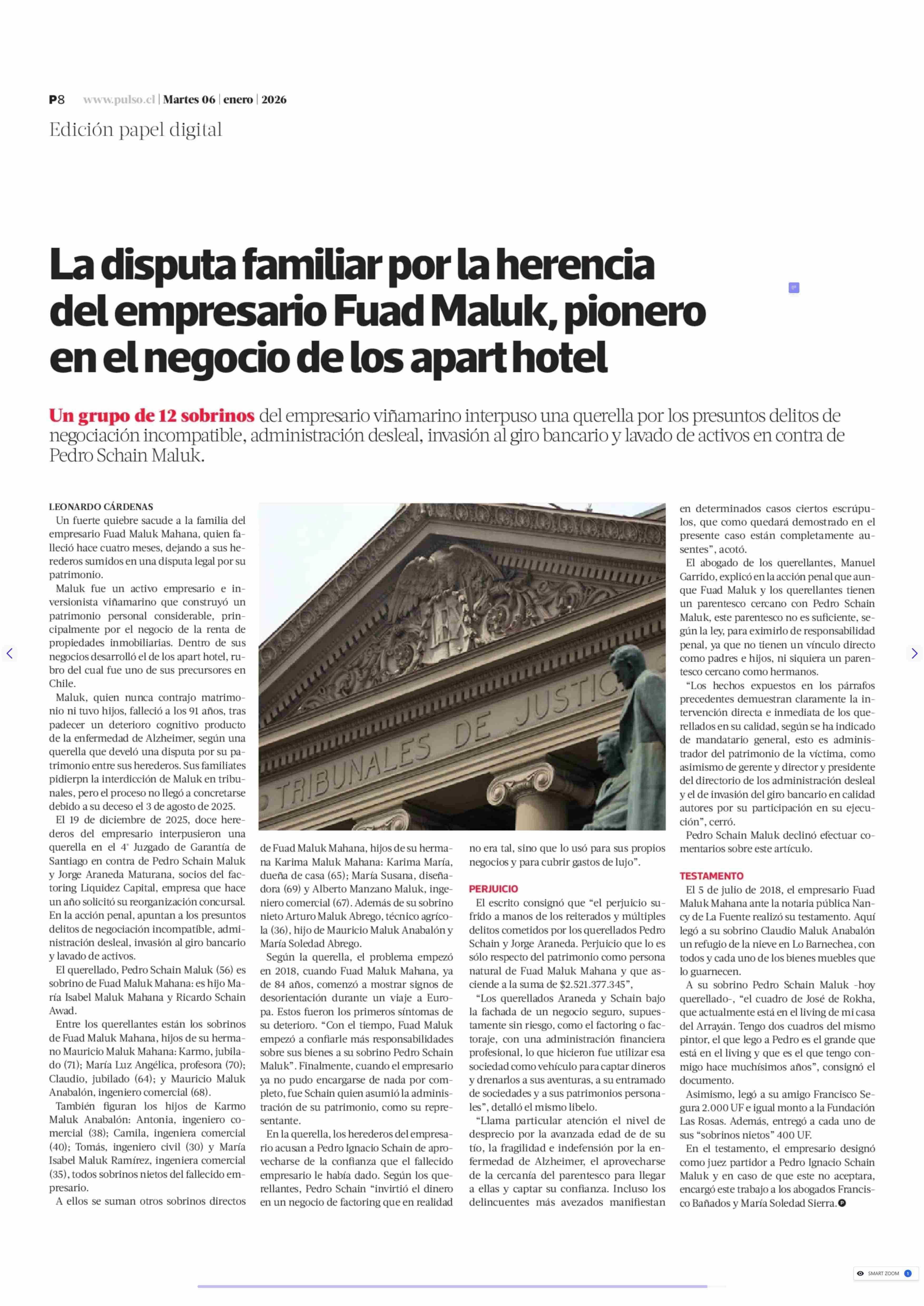 La disputa familiar por la herencia del empresario Fuad Maluk, pionero en el negocio de los apart hotel 06-01-2026 La Tercera |
